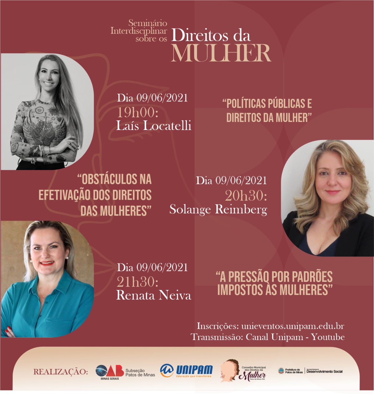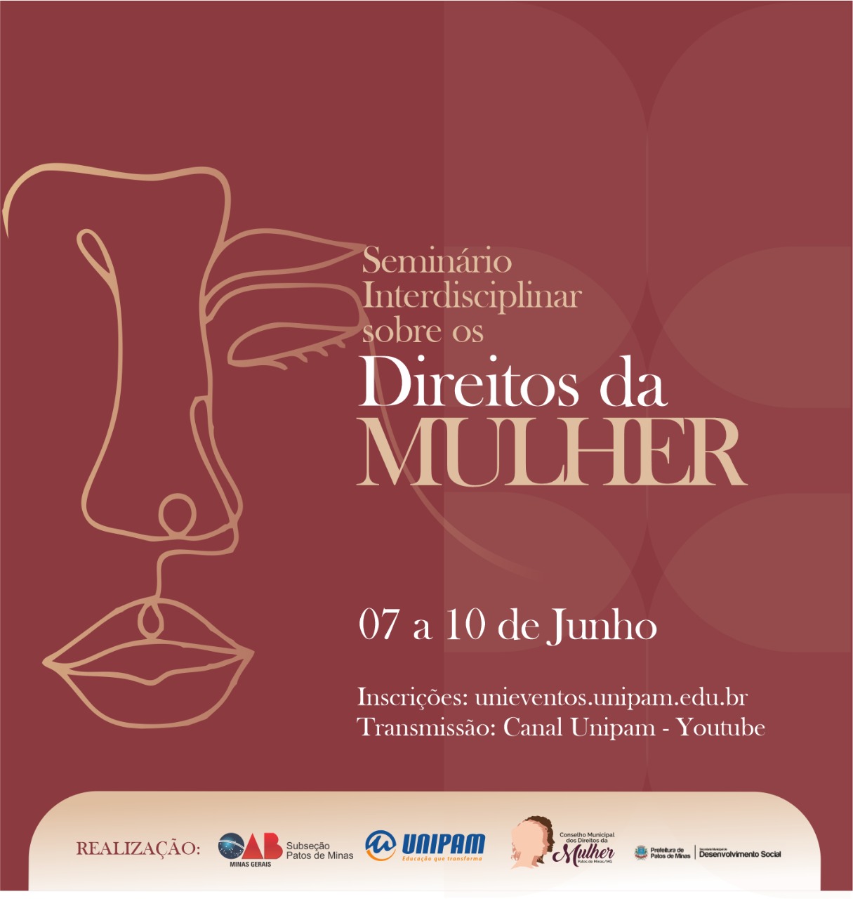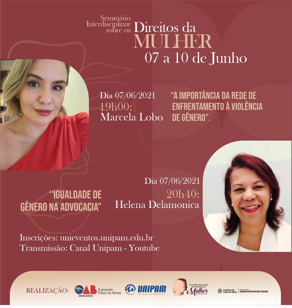 A Ordem dos Advogados do Brasil (OAB) – Subseção Patos de Minas, o Centro Universitário de Patos de Minas (UNIPAM), o Conselho Municipal dos Direitos da Mulher e a Prefeitura de Patos de Minas, por meio da Secretaria Municipal de Desenvolvimento Social, promoverão de 07 a 10 de junho, o “Seminário Interdisciplinar sobre os Direitos da Mulher”. A transmissão será feita por meio do Canal UNIPAM, no YouTube.
