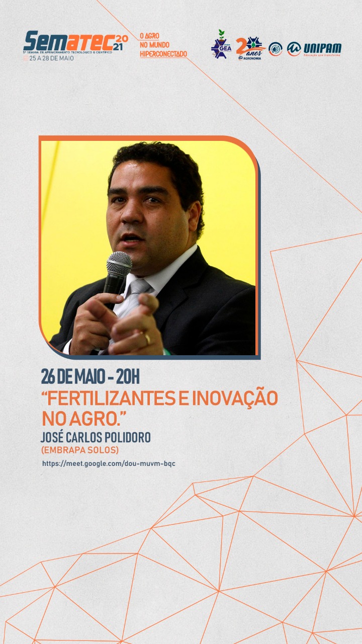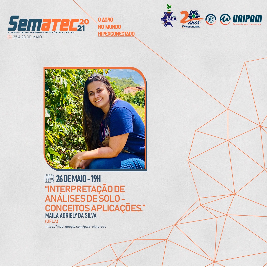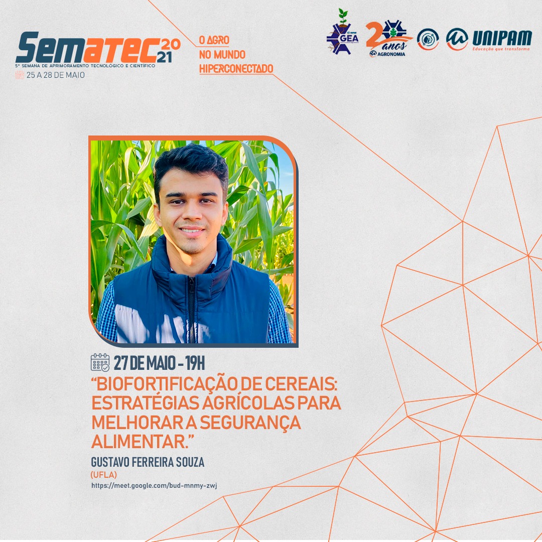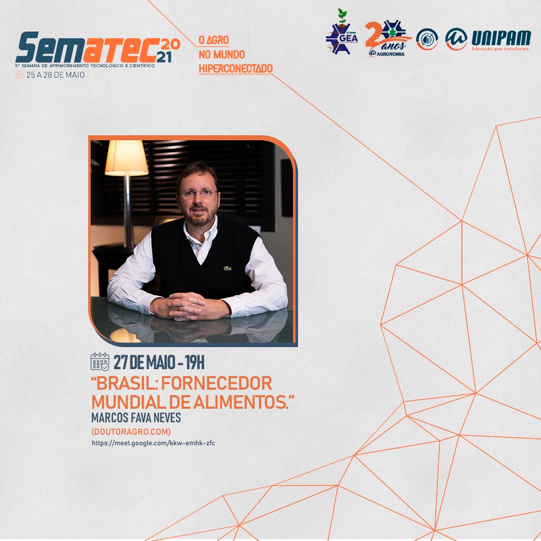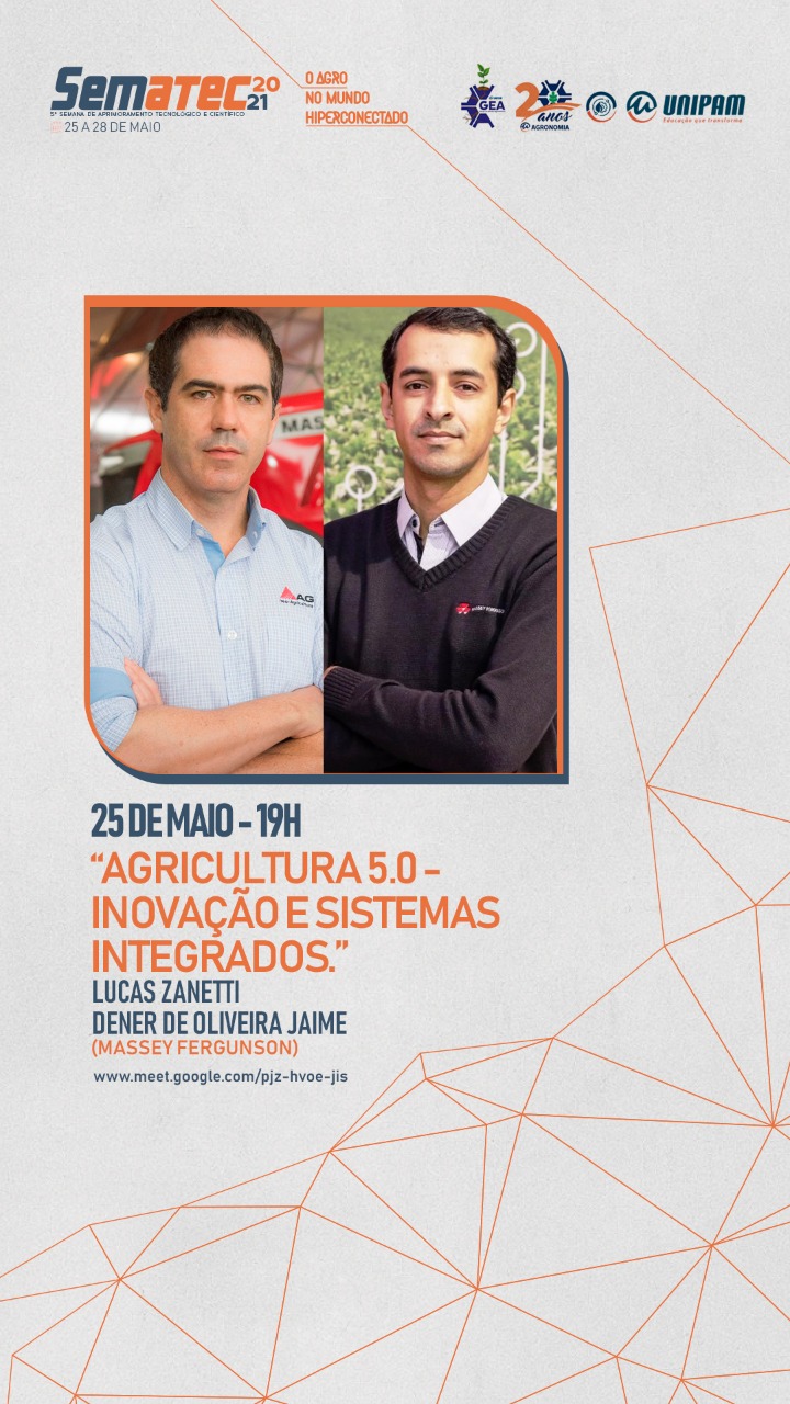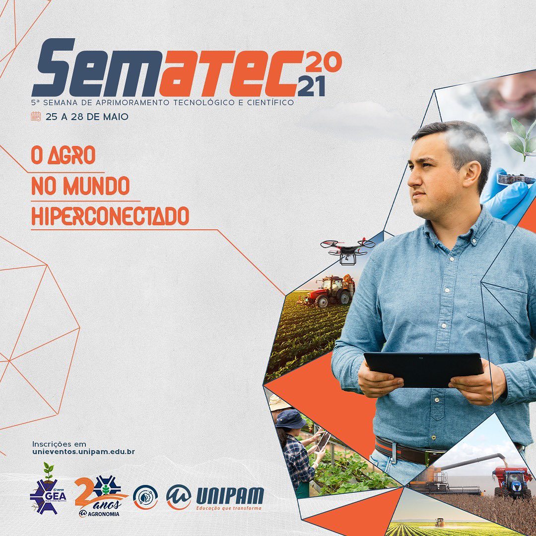 O curso de Agronomia do Centro Universitário de Patos de Minas (UNIPAM), promoverá de 25 a 28 de maio, a 5ª Semana de Aprimoramento Tecnológico e Científico (SEMATEC), que tem como tema “O Agro no Mundo Hiperconectado”. O evento acontecerá em formato on-line, por meio da plataforma Google Meet.
