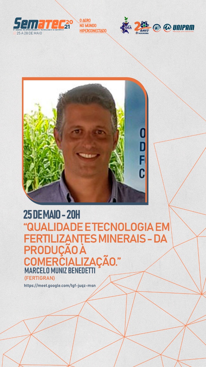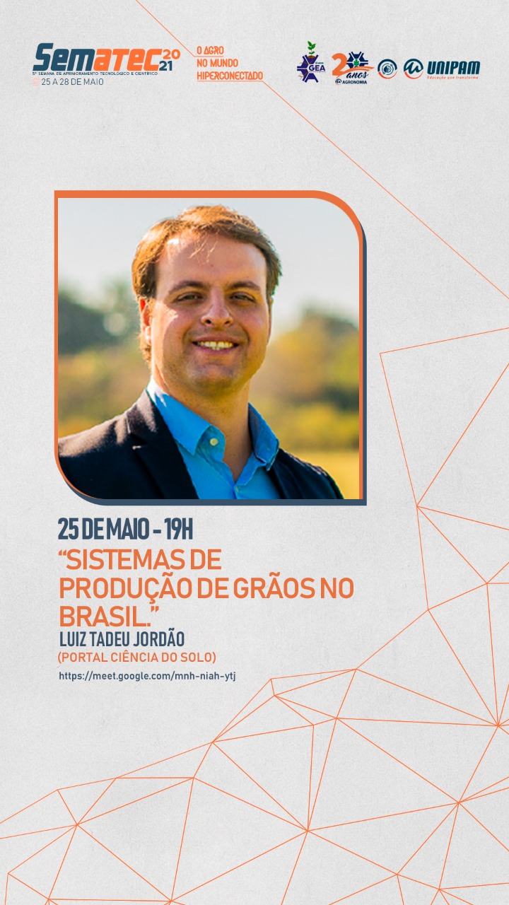 No primeiro dia do evento, terça-feira (25), serão ministradas as palestras “Agricultura 5.0: Inovação em Sistemas Integrados”, com Lucas Zanetti e Dener de Oliveira, da empresa Massey Fergunson; “Educação Digital”, com Antonio Carlos de Oliveira, da empresa My Farm Agro; “Sistema de Produção de Grãos no Brasil, com Luiz Tadeu Jordão, do Portal Ciência do Solo; “Produção de Sementes de Milho: Fatores Envolvidos com a Qualidade”, com Marcelo Fagioli, da Universidade de Brasília (UnB); “Agronomia: Introdução à Área de Vendas e seus Desafios”, com Carla Marisa Valdez, da Compo Expert; e “Qualidade e Tecnologia em Fertilizantes Minerais: Da Produção à Comercialização”, com Marcelo Muniz, da Fertigran Fertilizantes.