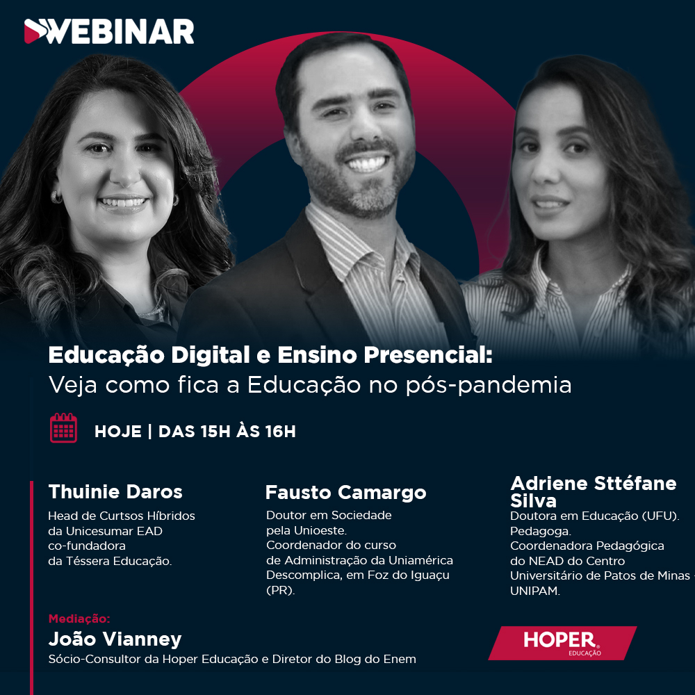 Juntamente com a docente, participarão do webinar, o doutor em Sociedade pela Universidade Estadual do Oeste do Paraná (UNIOESTE) e coordenador do curso de Administração da Uniamérica Descomplica, em Foz do Iguaçu (PR), Fausto Camargo, e a Head de Cursos Híbridos da Unicesumar EAD e co-fundadora da Téssera Educação, Thuinie Daros. O webinar será mediado pelo Sócio-Consultor da Hoper Educação e Diretor do Blog do ENEM, João Vianney.