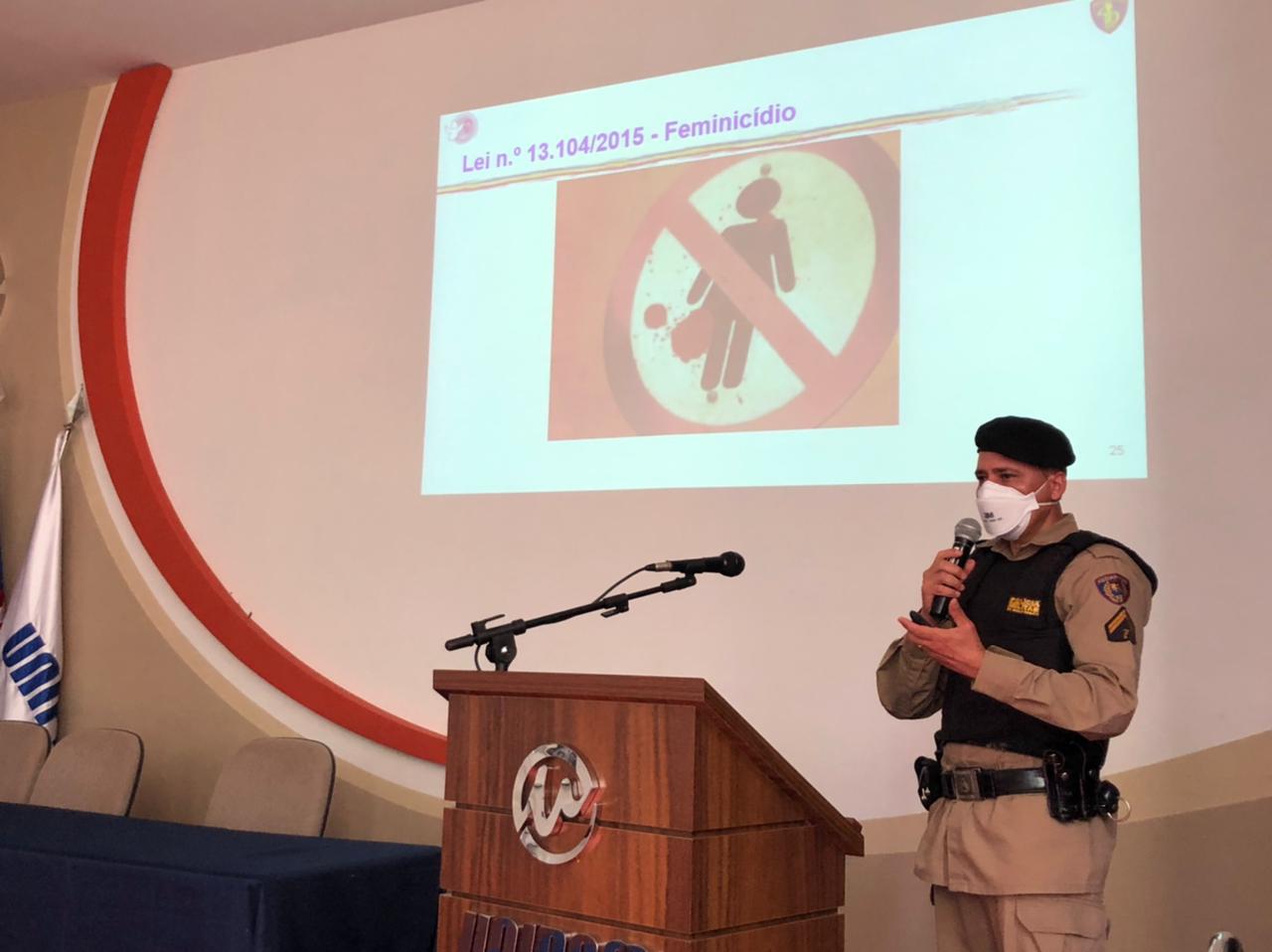 Na oportunidade foram abordados os temas: Lei Maria da Penha (11.340/2006), a legislação atinente à violência doméstica, medidas protetivas de urgência, campanhas, programas existentes e serviços de prevenção à violência doméstica, realizados pela Polícia Militar.