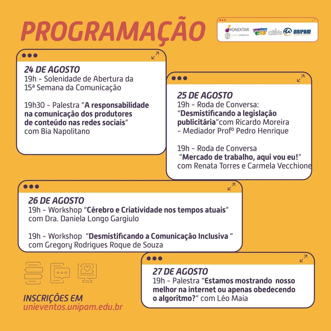 No segundo dia do evento, quarta-feira (25), das 19h às 21h, ocorrerá a roda de conversa: “Desmistificando a legislação publicitária”, com Ricardo Moreira, advogado formado pelo Centro Universitário de Goiás (UniGoiás) e especialista em Comunicação e Marketing pela Escola Superior de Propaganda e Marketing de São Paulo (ESPM/SP). Atuou como docente nos cursos de Publicidade e Propaganda e Comunicação Social na Fundação Armando Álvares Penteado (FAAP) e Universidade Paulista (UNIP), por mais de dez anos. É advogado especializado em Consultoria Jurídica, em Comunicação Publicitária e titular do site Propaganda Legal. Atende há mais de 20 anos agências de publicidade, propaganda, promoções, eventos e departamentos de marketing de empresas dos mais variados segmentos. A roda de conversa será mediada pelo publicitário, coordenador de marketing do Grupo Farroupilha e professor do curso de Publicidade e Propaganda do UNIPAM, Pedro Henrique de Sousa Ferreira.