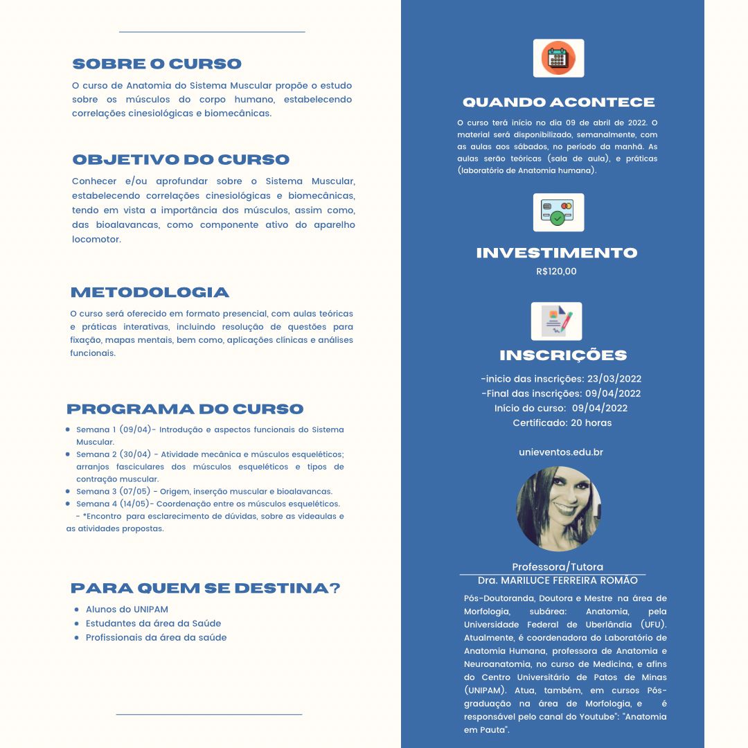 O Centro Universitário de Patos de Minas (UNIPAM) promoverá, nos meses de abril e de maio, o curso “Anatomia Humana - Sistema Muscular com Correlações Cinesiológicas e Biomecânicas”.
