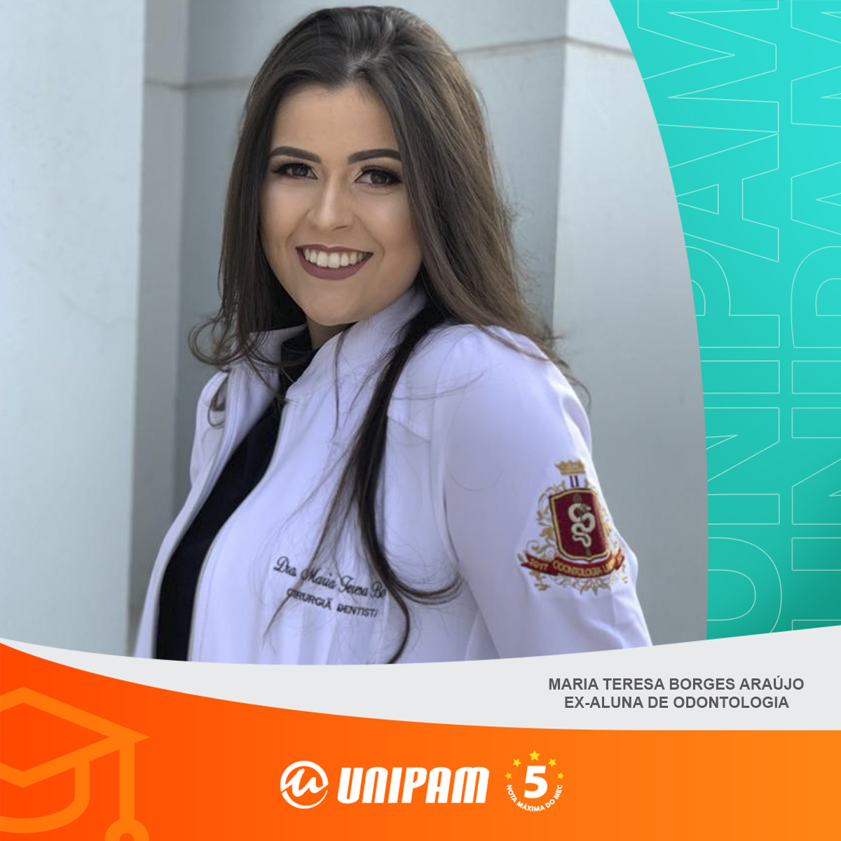 Maria Teresa Borges Araújo, ex-aluna do curso de Odontologia do Centro Universitário de Patos de Minas (UNIPAM), foi aprovada recentemente no Programa de Pós-Graduação em Saúde Coletiva - Mestrado, da Universidade Estadual Paulista "Júlio Mesquita Filho" (UNESP).