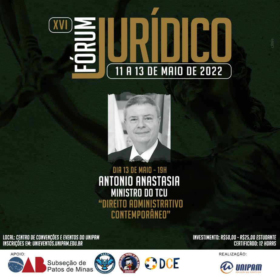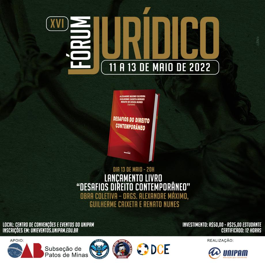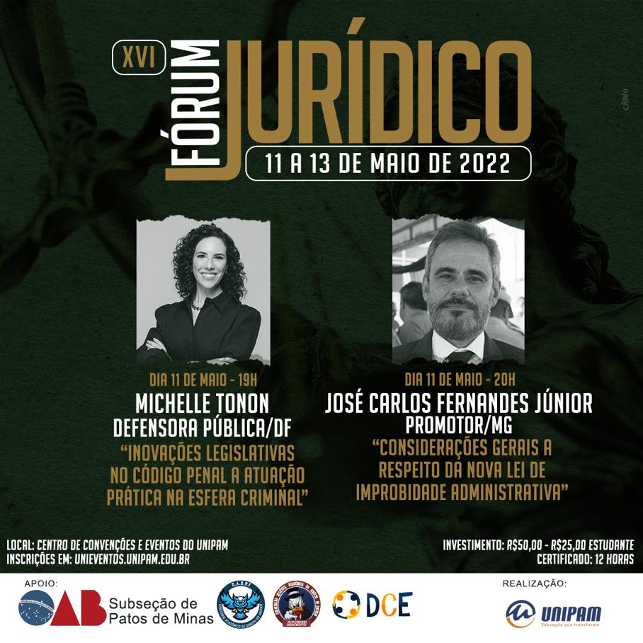 O curso de Direito do Centro Universitário de Patos de Minas (UNIPAM) promoverá, de 11 a 13 de maio, no Centro de Convenções e Eventos (CCE), a XVI edição do Fórum Jurídico.