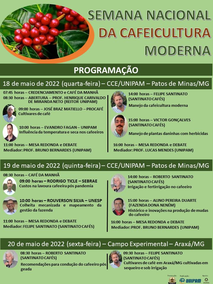 Ainda no segundo dia, às 14h, será realizada a palestra “Irrigação e Fertirrigação no Cafeeiro”, com o palestrante, Roberto Santinato, diretor da Santinato Cafés. Posteriormente, às 15h, a palestra “Histórico e Inovações na Produção de Mudas do Cafeeiro”, com o palestrante, Alino Pereira Duarte. Em seguida, haverá também uma mesa redonda e debate com o mediador, o professor do Unipam, Bruno Bernardes.