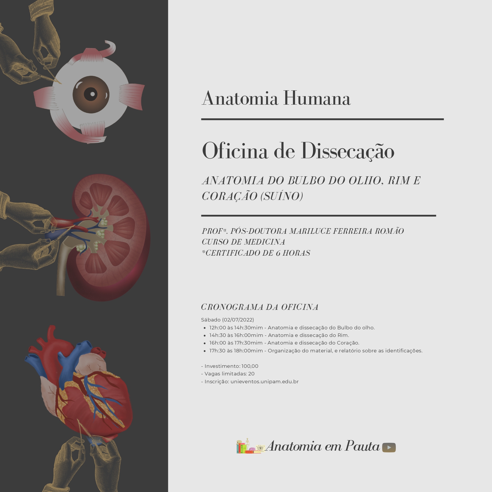 Mariluce Ferreira Romão, professora do Centro Universitário de Patos de Minas (UNIPAM), ministrará no dia 02 de julho (sábado), das 12h às 18h, uma oficina de dissecação com o tema “Anatomia do Bulbo do Olho, Rim e Coração (Suíno)”.