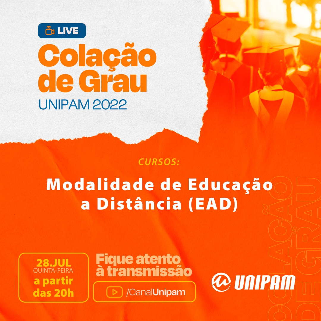 O Centro Universitário de Patos de Minas (UNIPAM) realiza na próxima quinta-feira (28), às 20h, no Centro de Convenções e Eventos (CCE), a cerimônia de Colação de Grau dos formandos dos seguintes cursos de Educação a Distância -EaD/ 2022: