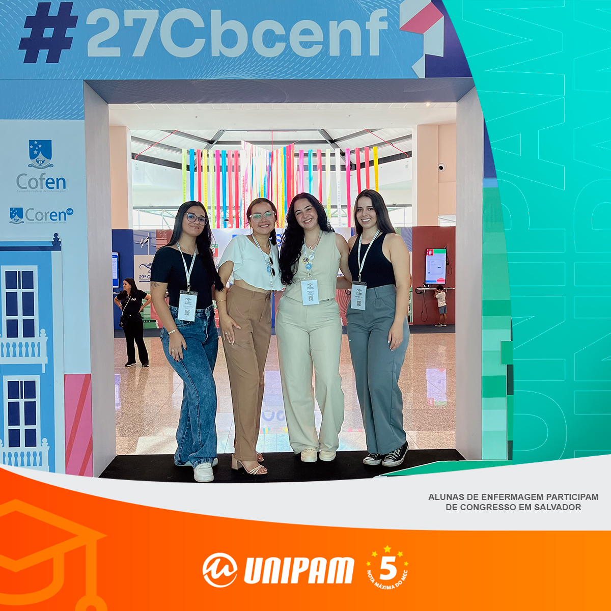 Amanda Machado Santana, Laura Nunes Gonçalves, Maria Eduarda Alves Faria e Mariana Coelho Braga, alunas do 8º período de Enfermagem do Centro Universitário de Patos de Minas (UNIPAM), viveram uma experiência única ao participar do 27º Congresso Brasileiro dos Conselhos de Enfermagem (CBCENF). O evento foi realizado em Salvador (BA), entre os dias 8 e 11 de setembro, e reuniu profissionais e estudantes de todo o Brasil.