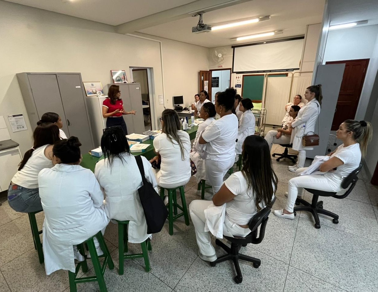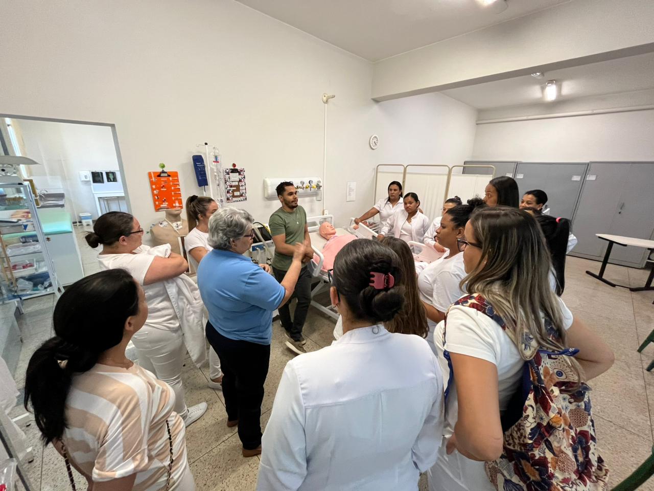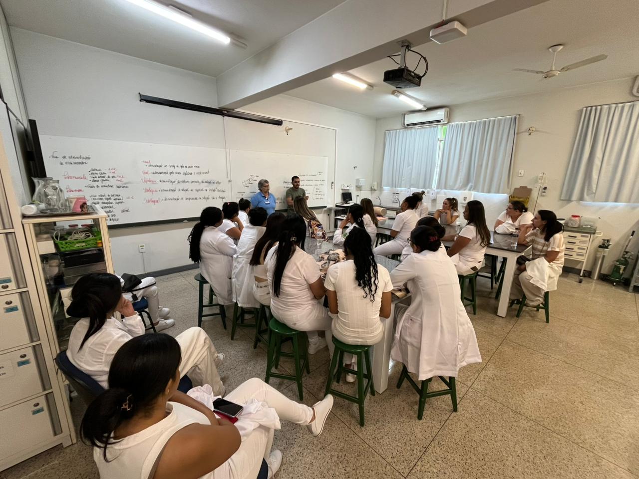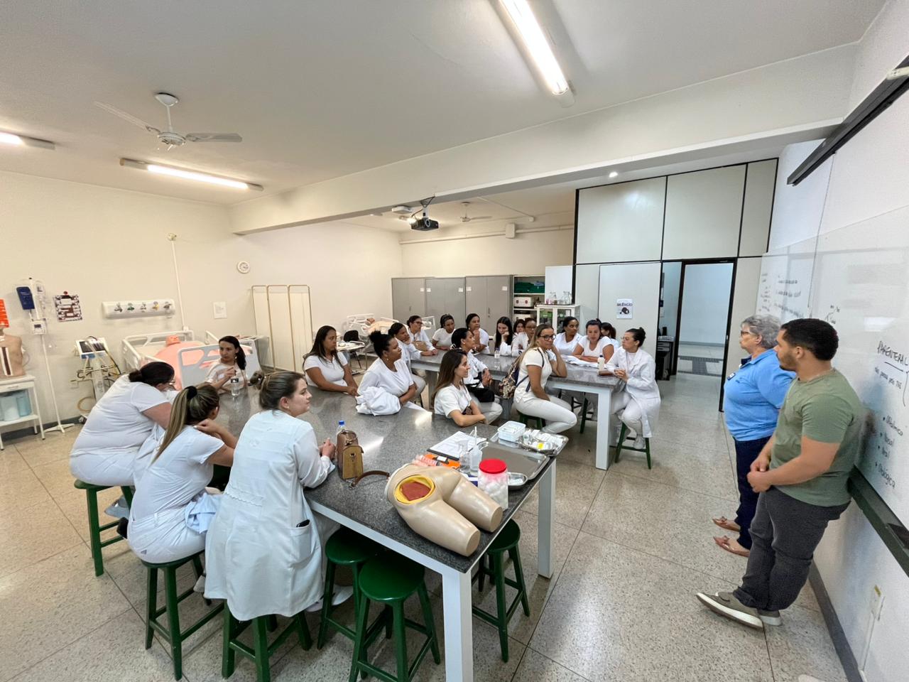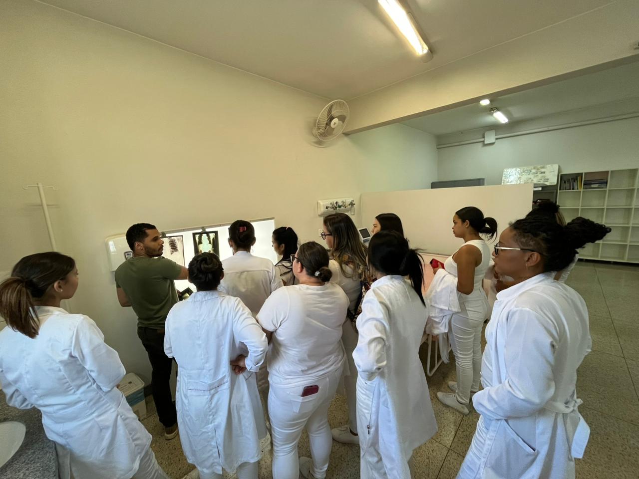 Na sequência, a visita seguiu para o Laboratório de Técnicas de Enfermagem. Na ocasião, a monitora Vera Lúcia Moreira e o acadêmico Maycon Douglas compartilharam as principais atividades realizadas no local e demonstraram como os alunos aplicam, na prática, os conhecimentos adquiridos em sala de aula.