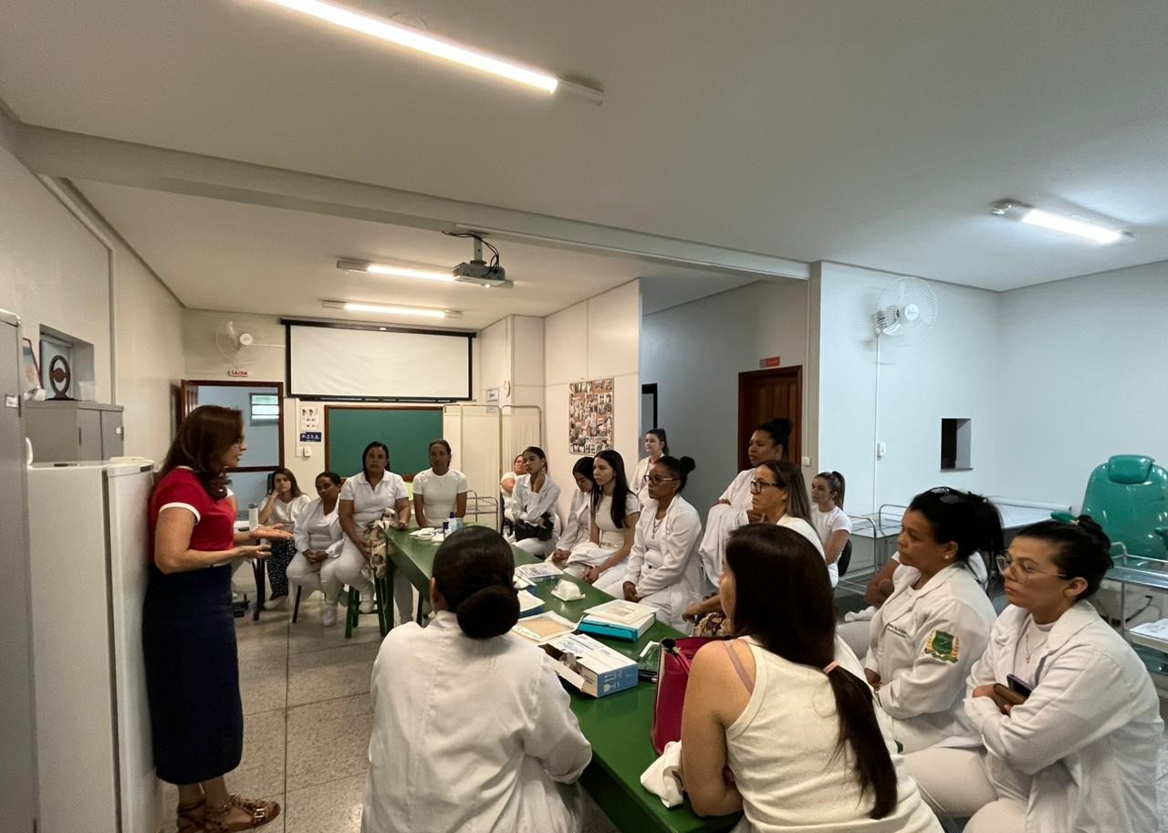Em seguida, o grupo foi recebido no Ambulatório de Enfermagem Anna Nery pela coordenadora do curso de Enfermagem, professora Me. Odilene Gonçalves. Durante o encontro, ela apresentou as instalações, explicou a dinâmica das aulas práticas e conversou com as estudantes sobre a importância do cuidado humanizado no atendimento aos pacientes.