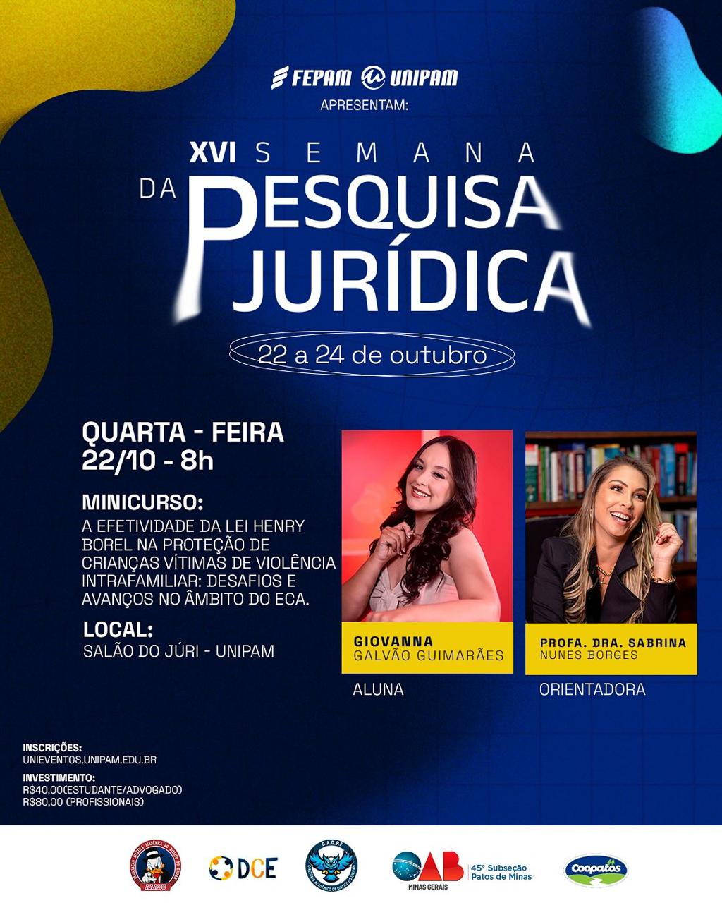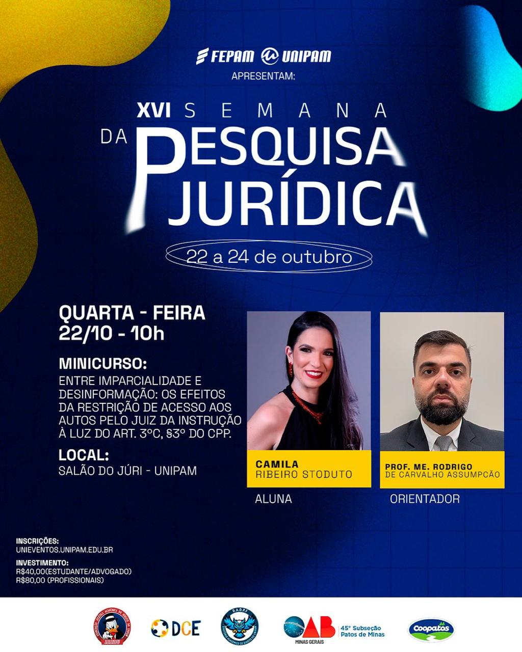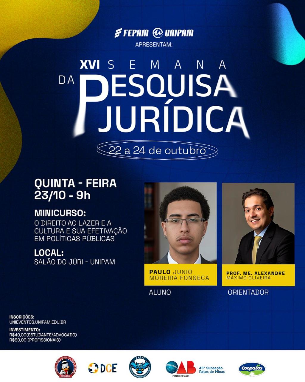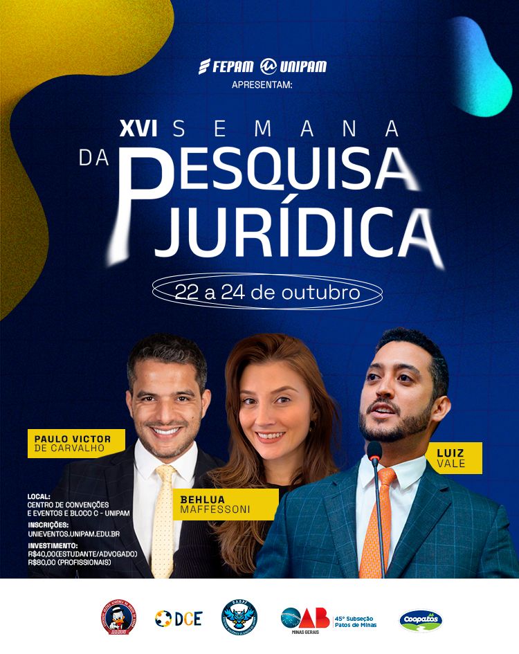 O curso de Direito do Centro Universitário de Patos de Minas (UNIPAM) promoverá, de 22 a 24 de outubro, no Bloco C e no Centro de Convenções e Eventos (CCE), a 16ª Semana da Pesquisa Jurídica. O evento contará com palestras, com minicursos e com apresentações orais e de pôsteres, reunindo professores, alunos e profissionais da área jurídica em um espaço de troca de conhecimento e de experiências.