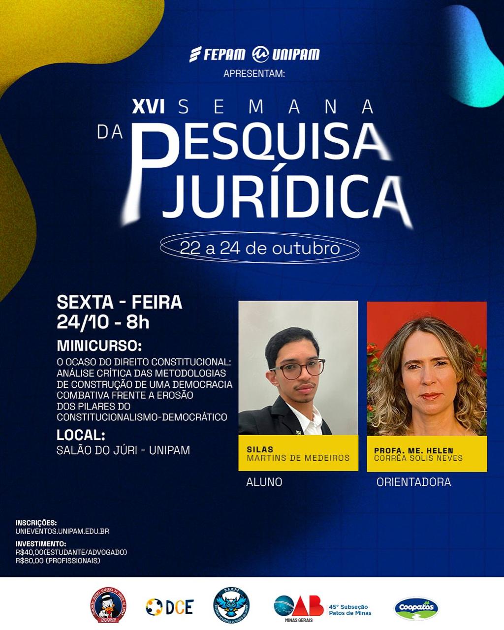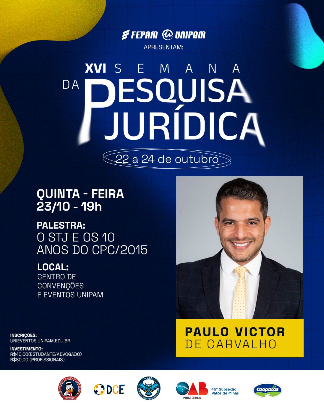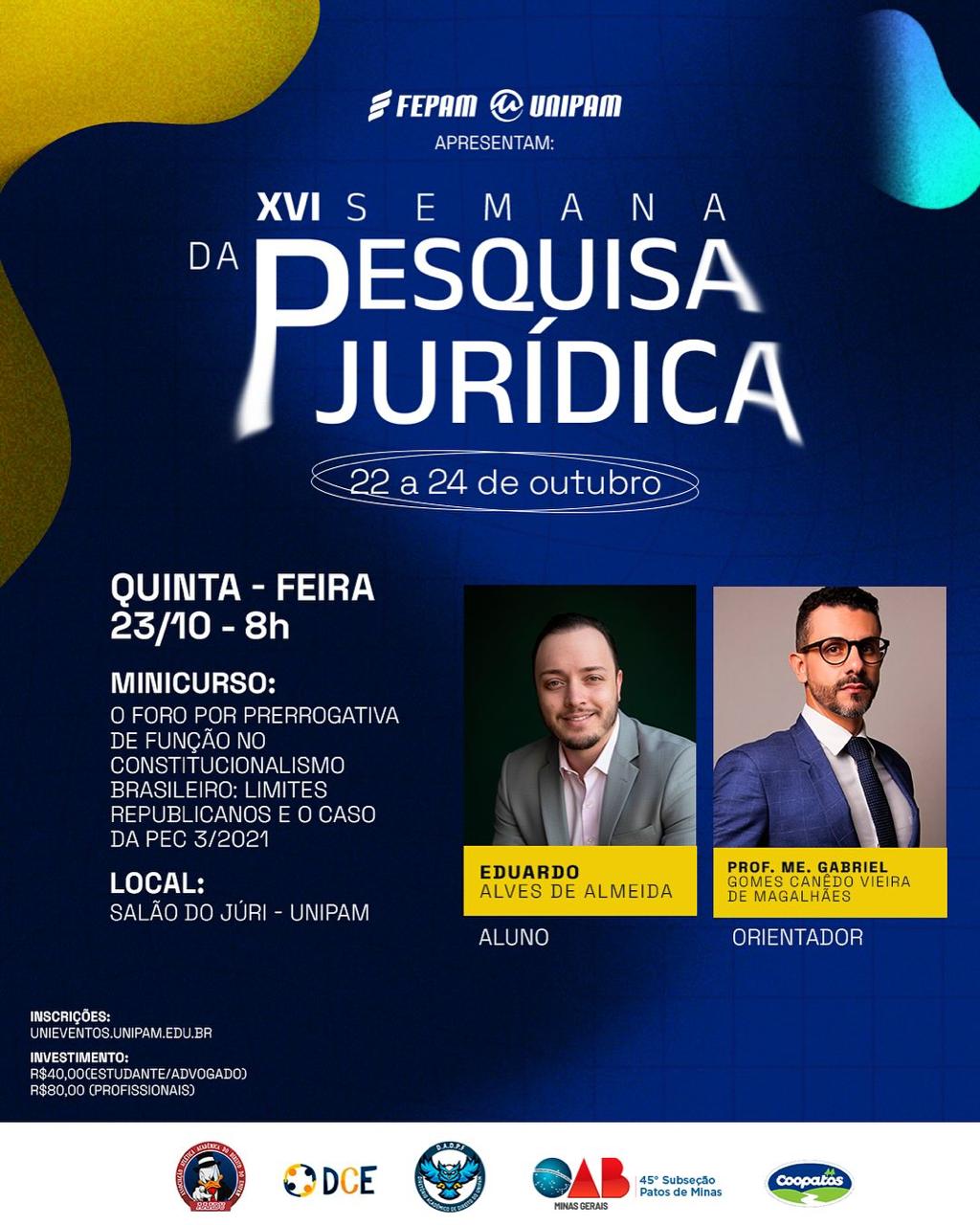 O curso de Direito do Centro Universitário de Patos de Minas (UNIPAM) promoverá, de 22 a 24 de outubro, no Bloco C e no Centro de Convenções e Eventos (CCE), a 16ª Semana da Pesquisa Jurídica. O evento contará com palestras, com minicursos e com apresentações orais e de pôsteres, reunindo professores, alunos e profissionais da área jurídica em um espaço de troca de conhecimento e de experiências.