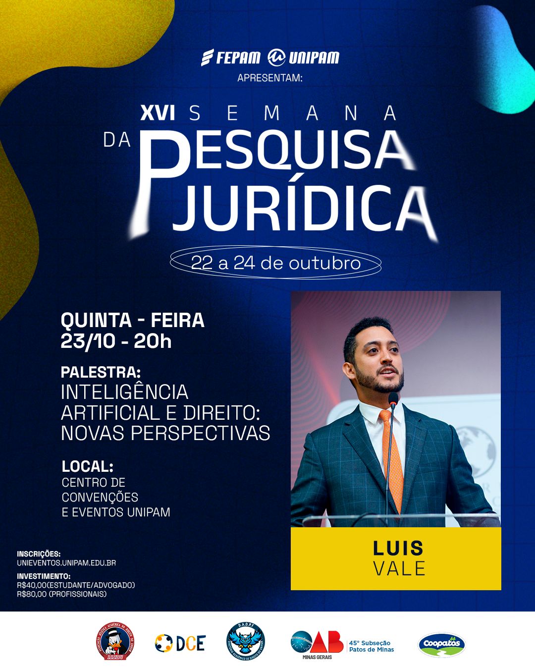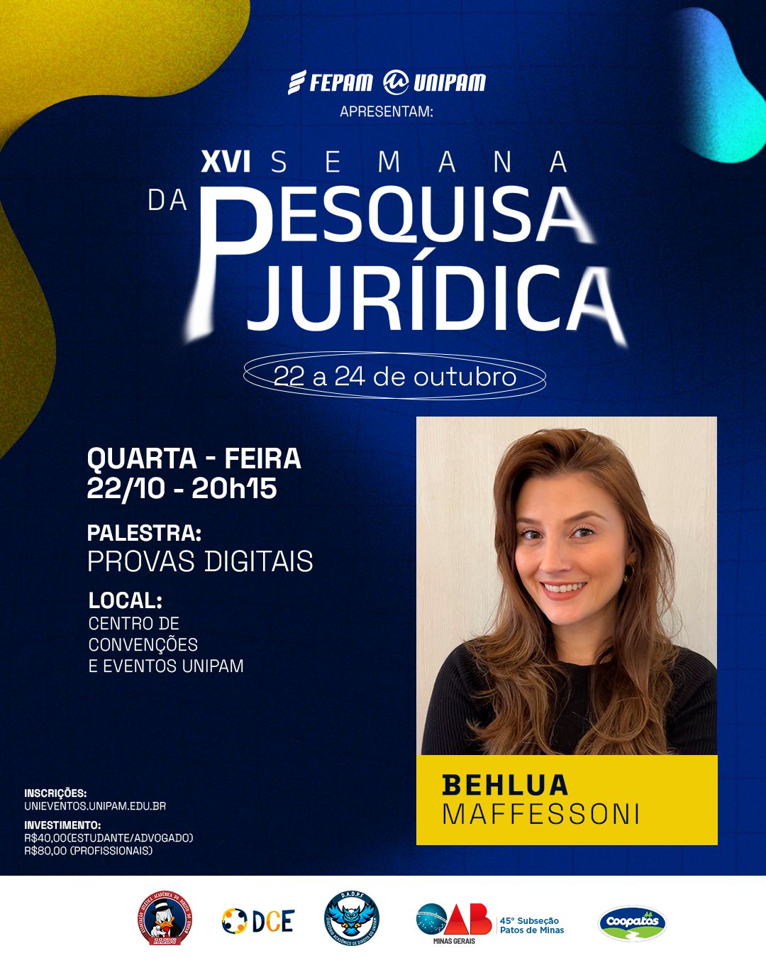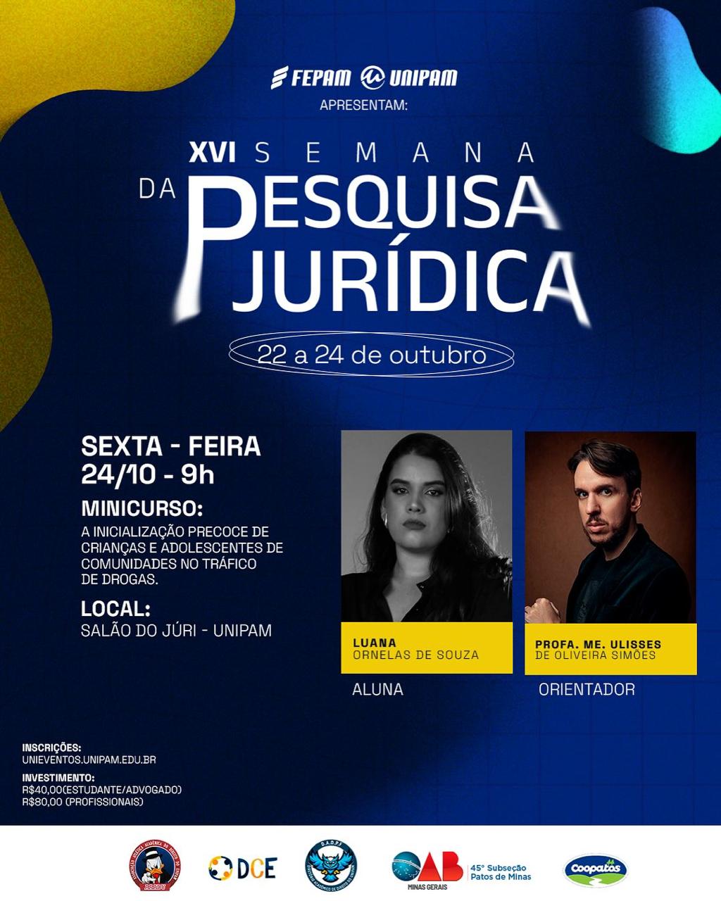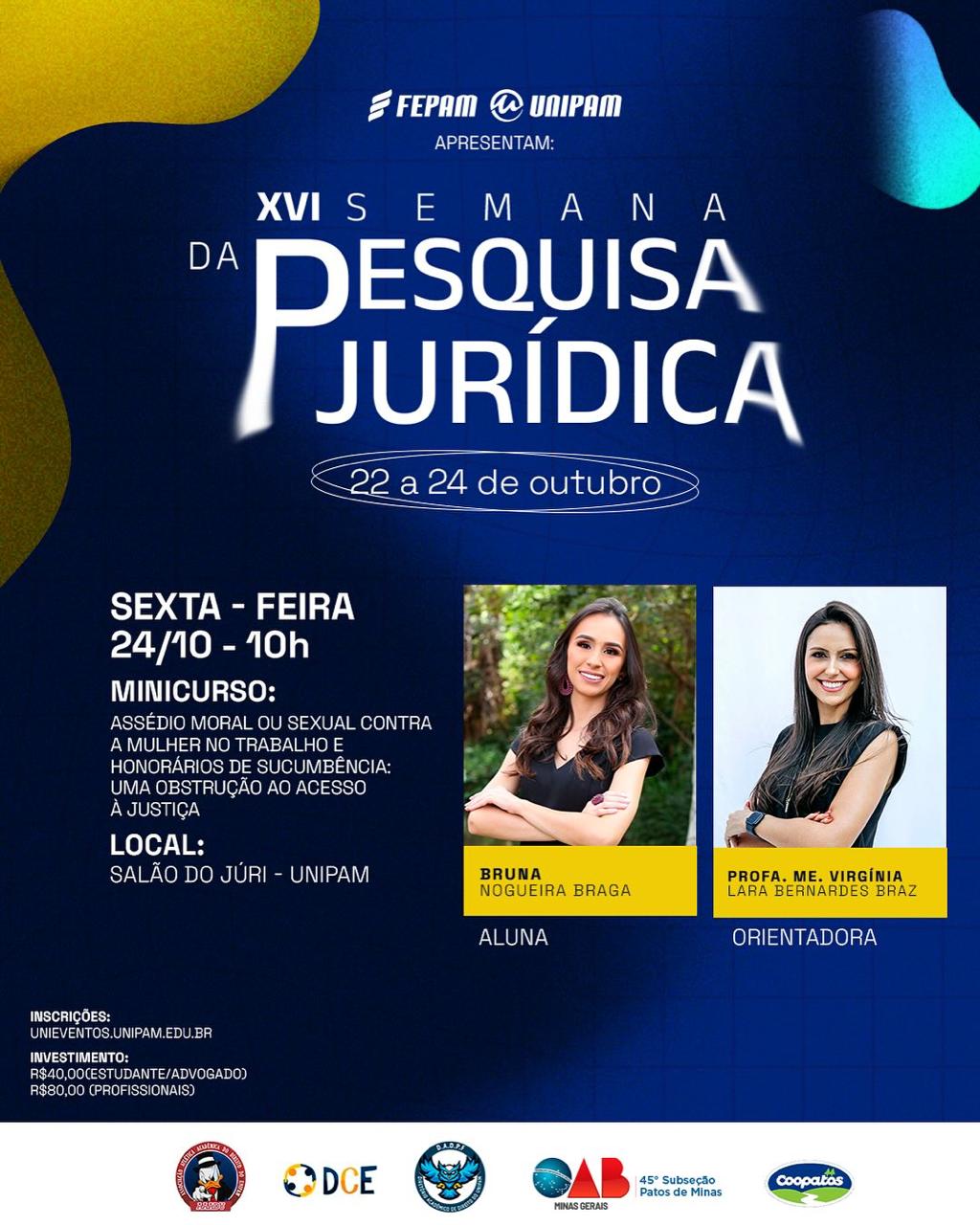 O curso de Direito do Centro Universitário de Patos de Minas (UNIPAM) promoverá, de 22 a 24 de outubro, no Bloco C e no Centro de Convenções e Eventos (CCE), a 16ª Semana da Pesquisa Jurídica. O evento contará com palestras, com minicursos e com apresentações orais e de pôsteres, reunindo professores, alunos e profissionais da área jurídica em um espaço de troca de conhecimento e de experiências.