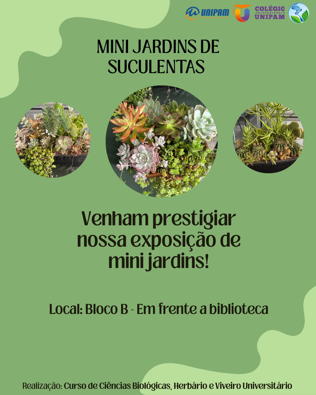 O Curso de Ciências Biológicas do Centro Universitário de Patos de Minas (UNIPAM), em parceria com o Herbário Mandevilla e o Viveiro Universitário, promove de 27 a 31 de outubro, no Bloco B, em frente à Biblioteca, a Exposição de Minijardins.