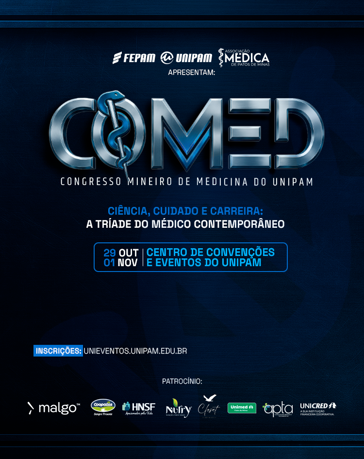 O Centro Universitário de Patos de Minas (UNIPAM) sediará, entre os dias 29 de outubro e 1º de novembro, mais uma edição do Congresso Mineiro de Medicina (COMED). O evento, voltado para acadêmicos e profissionais da área da saúde, contará com uma ampla programação de minicursos, palestras, mesas-redondas e apresentações científicas, que abordarão temas atuais e relevantes da prática médica. Este ano, o congresso tem como tema “Ciência, Cuidado e Carreira: a Tríade do Médico Contemporâneo”.