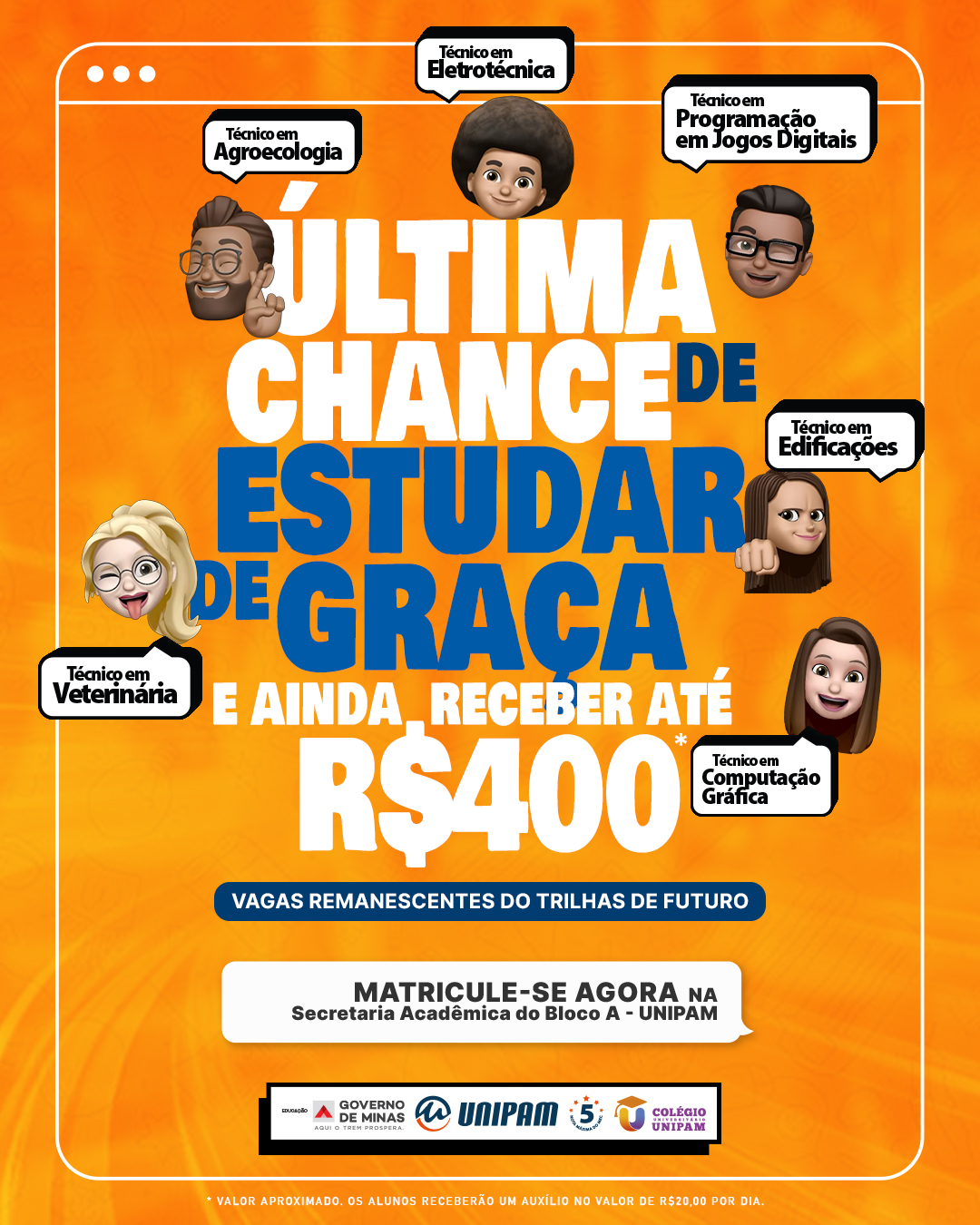 O Colégio Universitário está com matrículas abertas, até quarta-feira (17), para as vagas remanescentes do “Trilhas de Futuro”. O programa, idealizado pelo governo do Estado de Minas Gerais, objetiva capacitar jovens e adultos para atuarem no mercado de trabalho por meio da formação técnica gratuita. Além da gratuidade do curso, os estudantes receberão auxílio de transporte e de alimentação. Será oferecido R$20,00, por dia de aula, totalizando até R$400,00 mensais.