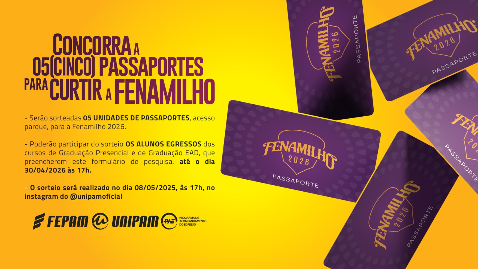 Serão sorteados cinco passaportes, de acesso ao parque, para a Fenamilho 2026. Os interessados deverão preencher o formulário de pesquisa, enviado no e-mail, até às 17h, do dia 30 de abril (quinta-feira). O sorteio será realizado no dia 08 de maio (sexta-feira), às 17h, no perfil do Instagram, @unipamoficial.
