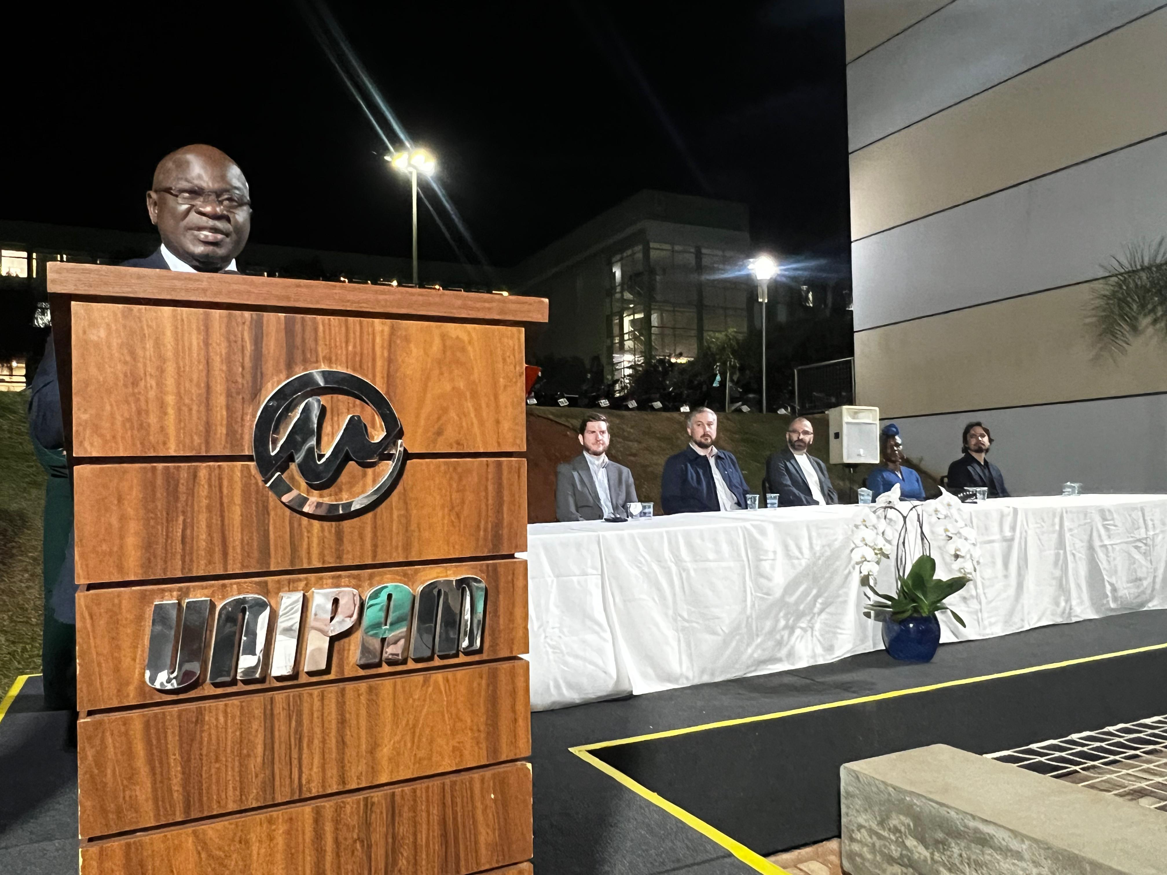 À noite, eles participaram da cerimônia de recepção, realizada na Praça das Nações. Inicialmente, ocorreu a composição da mesa de honra, composta pelas seguintes autoridades: o reitor do UNIPAM, professor Dr. Henrique Carivaldo de Miranda Neto; o presidente da Fundação Educacional de Patos de Minas (FEPAM), Sr. Paulo Vinícius Piva Hartmann; o integrante do Núcleo de Internacionalização e Mobilidade Acadêmica (NIMA) e coordenador do Projeto Costa do Marfim/ Gabão, professor Me. Fabrício Rocha de Oliveira; o presidente do Instituto Daniel Franco (IDF), professor Dr. Daniel de Oliveira Franco; o administrador-geral da Agropag, no Gabão, senhor Guy Anicet Rerambyath; e a embaixadora da República de Botsuana no Brasil, senhora Benetia Tumelo Chingapane.