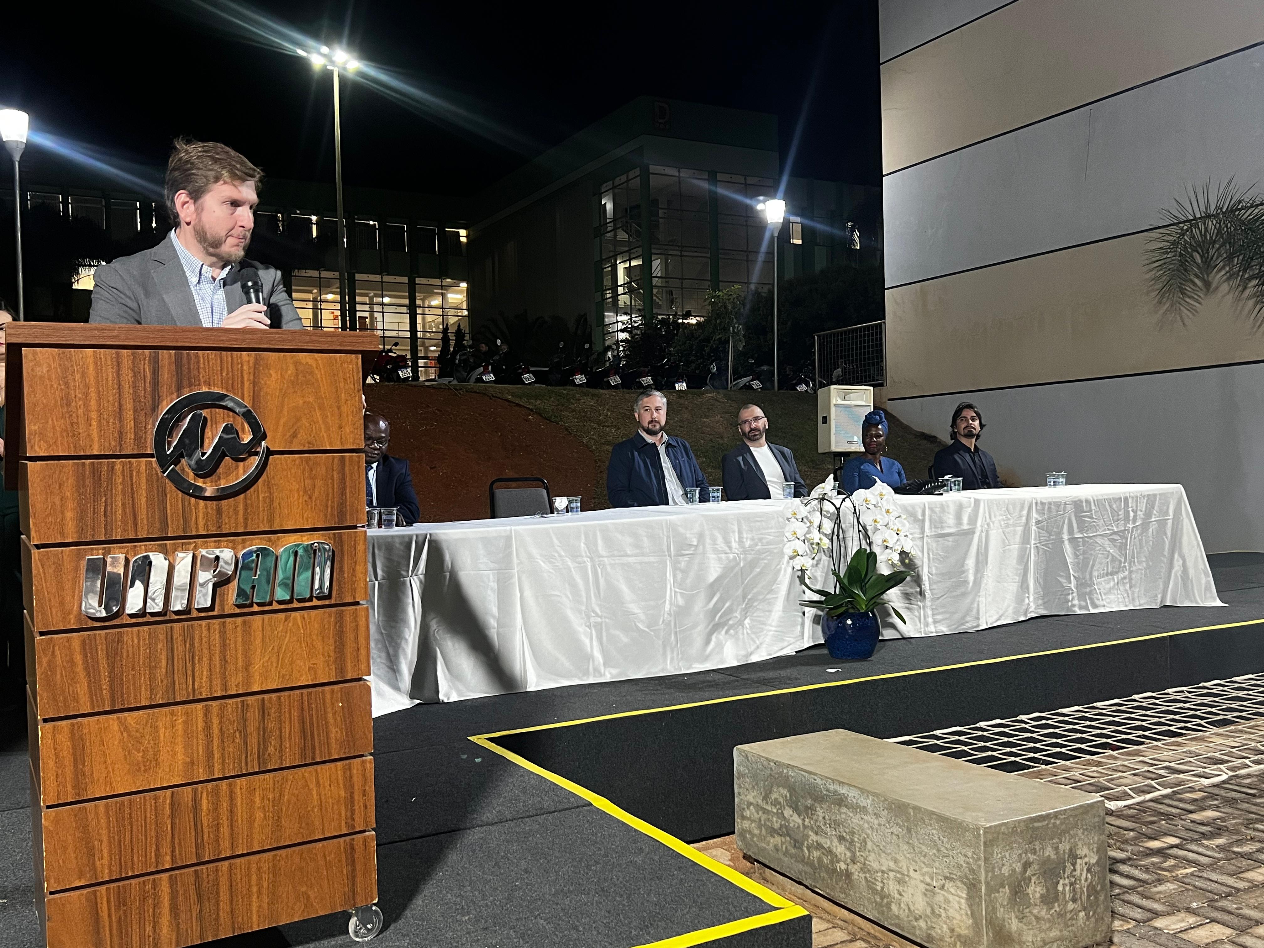 Posteriormente, para celebrar o intercâmbio acadêmico, científico e cultural entre as nações, o aluno, Mouloungui Eris, realizou o hasteamento da bandeira do Gabão. Logo após, a Banda de Música da 10ª Região de Polícia Militar executou o hino do Brasil. Em seguida, ocorreram os pronunciamentos do evento, na sequência: o administrador-geral da Agropag, no Gabão, senhor Guy Anicet Rerambyath; o presidente do IDF, professor Dr. Daniel de Oliveira Franco; o presidente da FEPAM, senhor Paulo Vinícius Piva Hartmann; e o reitor do UNIPAM, professor Dr. Henrique Carivaldo de Miranda Neto.