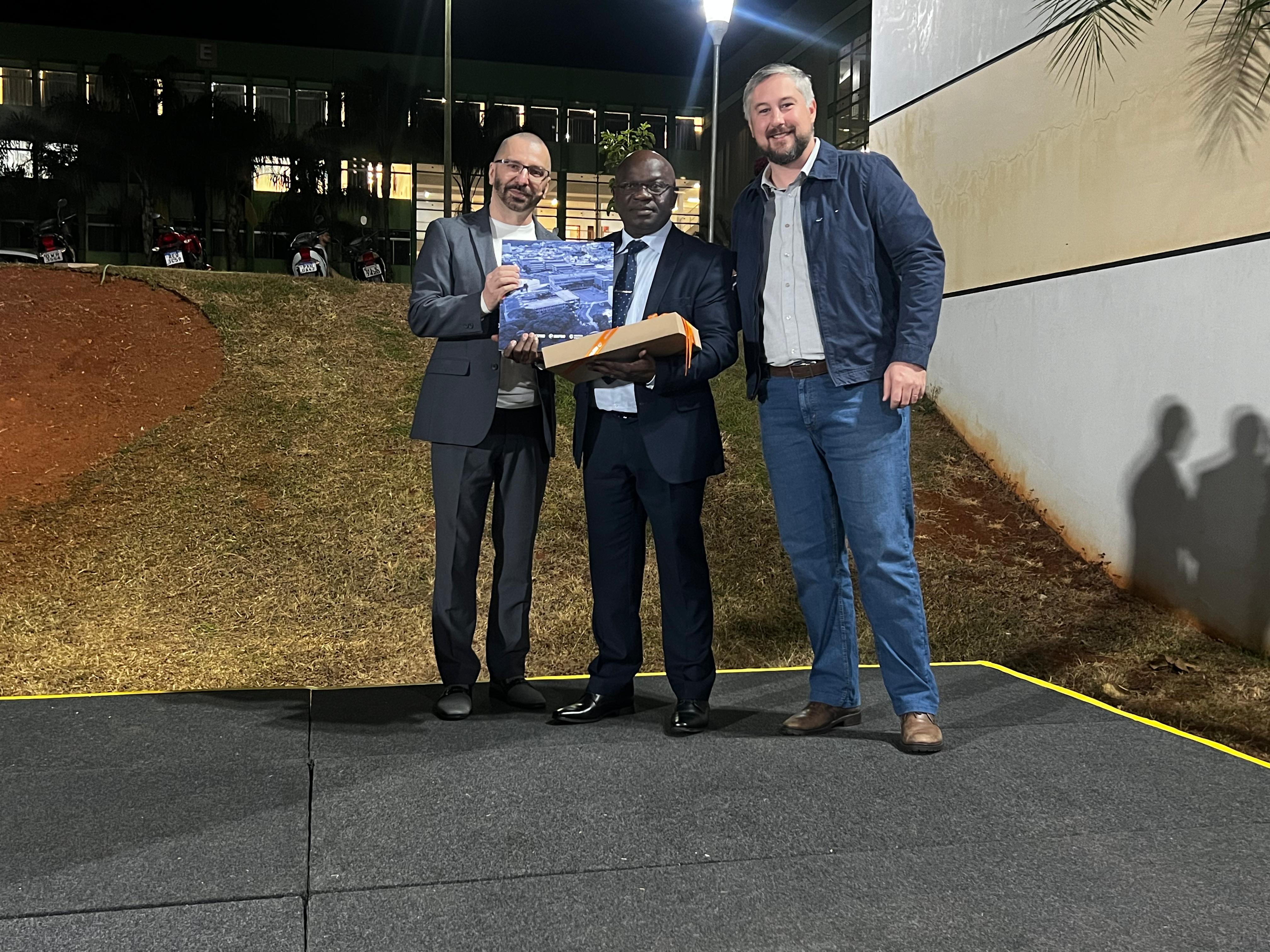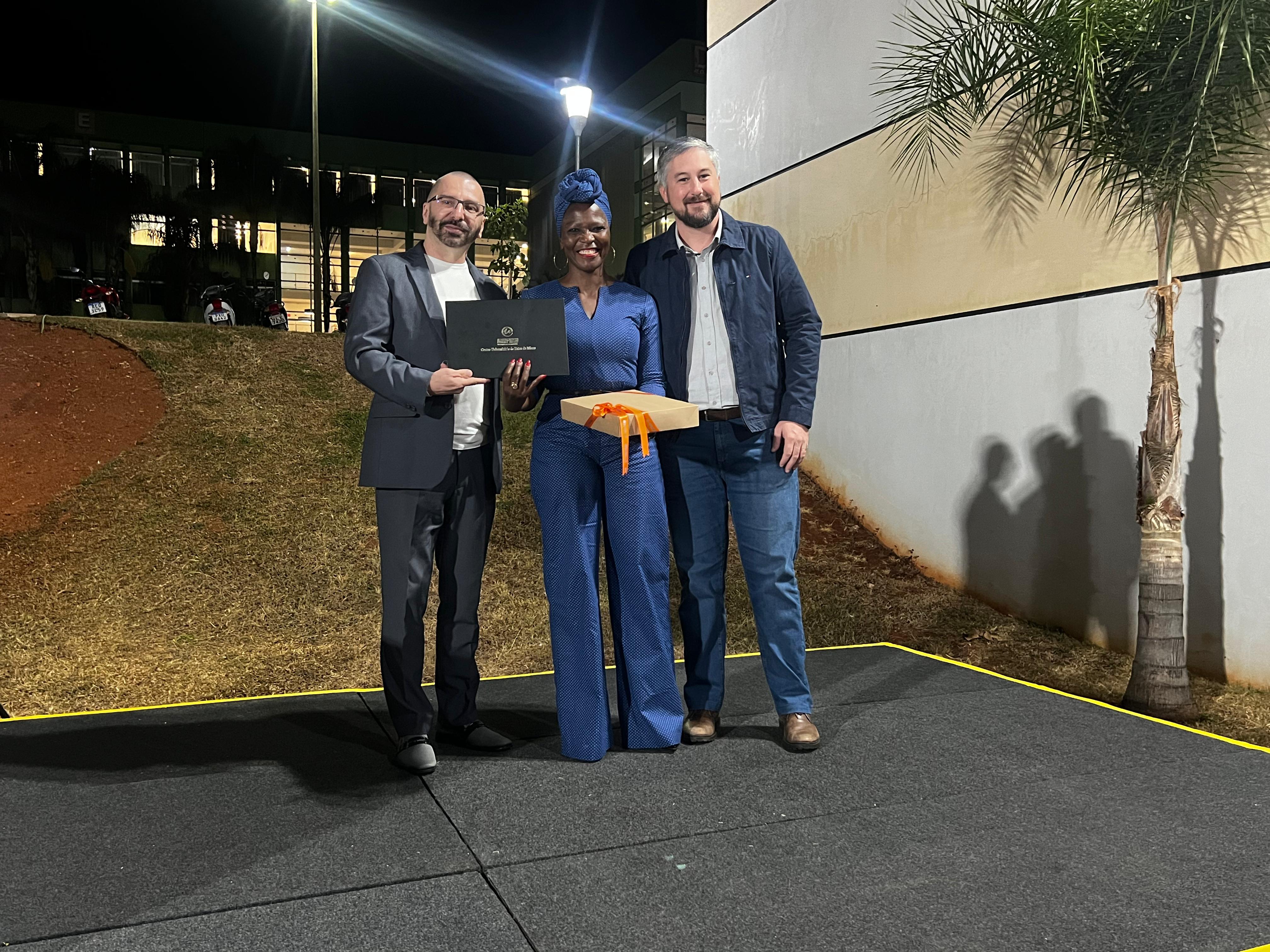 Para encerrar, em agradecimento e reconhecimento aos esforços para o estabelecimento de laços de cooperação acadêmica, científica e cultural, por meio de seu processo de internacionalização, ocorreu a entrega de certificados de reconhecimento público à embaixadora da República de Botsuana no Brasil, senhora Benetia Tumelo Chingapane; ao presidente do IDF, professor Dr. Daniel de Oliveira Franco; e ao integrante do NIMA e coordenador do Projeto Costa do Marfim/ Gabão, professor Me. Fabrício Rocha de Oliveira. O administrador-geral da Agropag, no Gabão, senhor Guy Anicet Rerambyath, em visita anteriormente realizada ao UNIPAM, já havia recebido o certificado de reconhecimento público. Na ocasião, ele foi agraciado com uma lembrança da instituição.