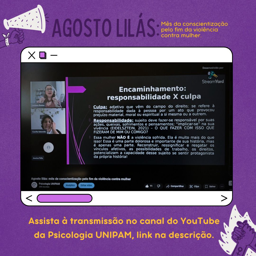 As palestras foram transmitidas no canal do curso de Psicologia, no YouTube. Na oportunidade, a psicóloga, psicanalista e professora Luciana Bastos, abordou o tema “O Acolhimento a Mulheres em Situação de Violência: Limites e Possibilidades”. Logo após, a psicóloga clínica, psicanalista e professora universitária Cecília Salomão, discutiu sobre “Violência Doméstica: Um Olhar Interseccional sobre Raça, Gênero e Orientação Sexual”.