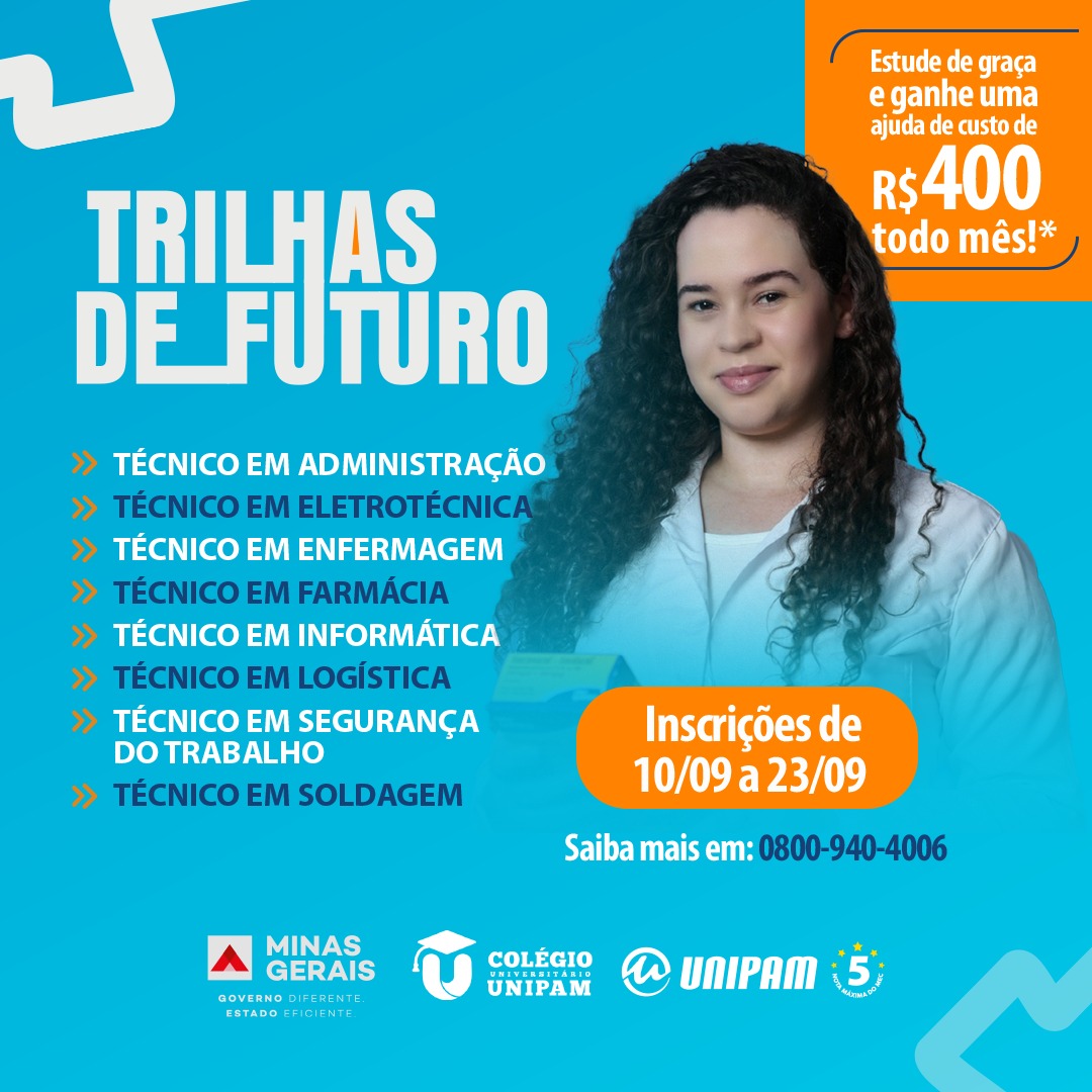 O Colégio Universitário, do Centro Universitário de Patos de Minas (UNIPAM), foi contemplado com o “Trilhas de Futuro”. Um programa do governo do Estado de Minas Gerais que tem por intuito capacitar jovens e adolescentes para atuarem no mercado de trabalho, por meio da formação técnica gratuita. Além da gratuidade do curso, os estudantes receberão auxílio de transporte e de alimentação. Será oferecido R$20,00, por dia de aula, totalizando até R$400,00 mensais.