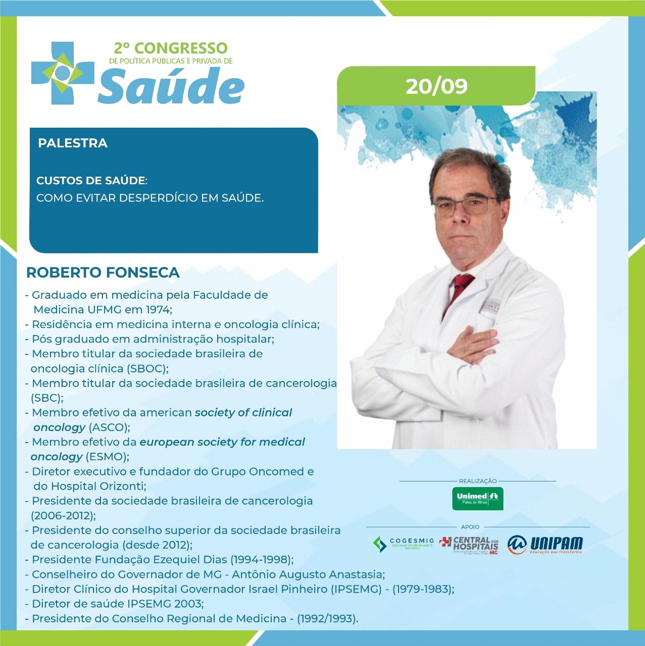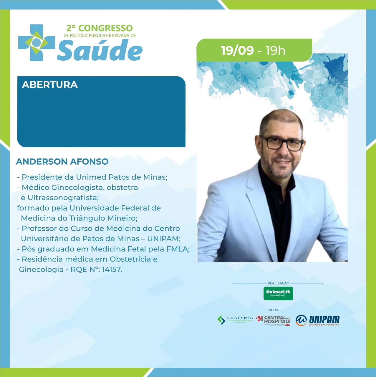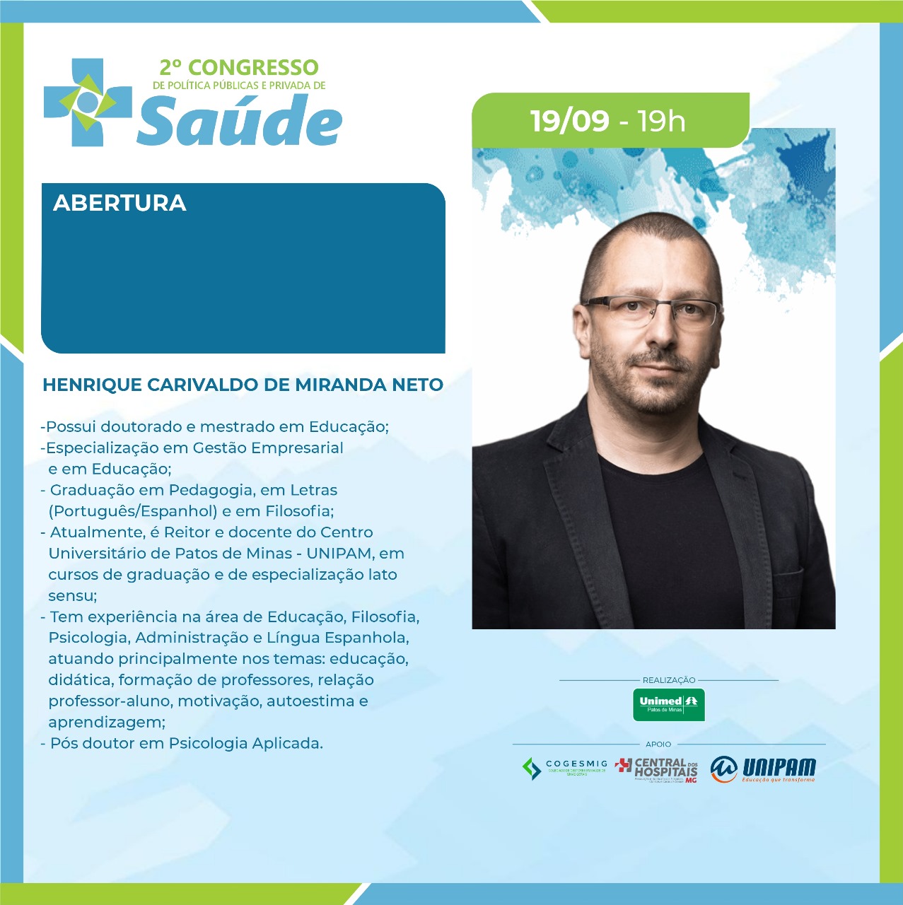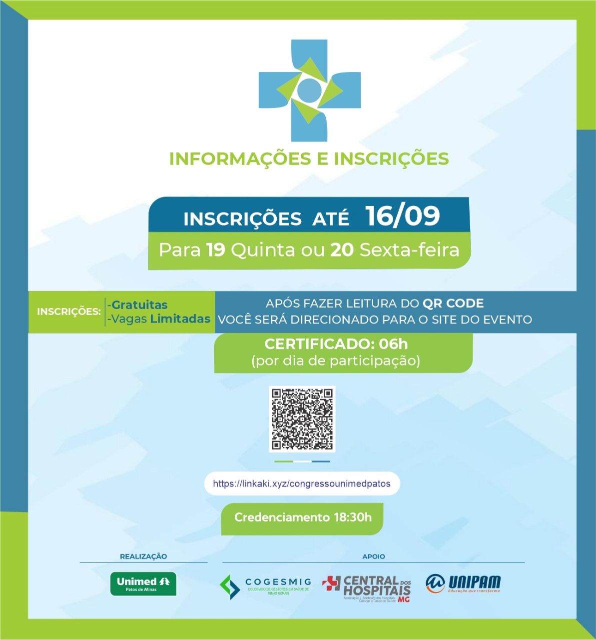 Será promovido, nos dias 19 e 20 de setembro, no Salão do Júri do Centro Universitário de Patos de Minas (UNIPAM), o “2º Congresso de Políticas Públicas e Privadas de Saúde”. O evento é realizado pela Unimed Patos de Minas e conta com o apoio do UNIPAM, do Colegiado de Gestores em Saúde de Minas Gerais (Cogesmig) e da Central dos Hospitais de Minas Gerais.
