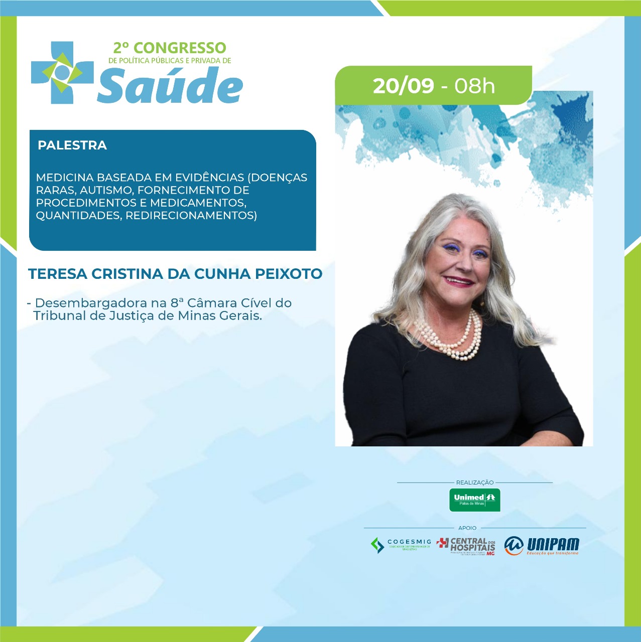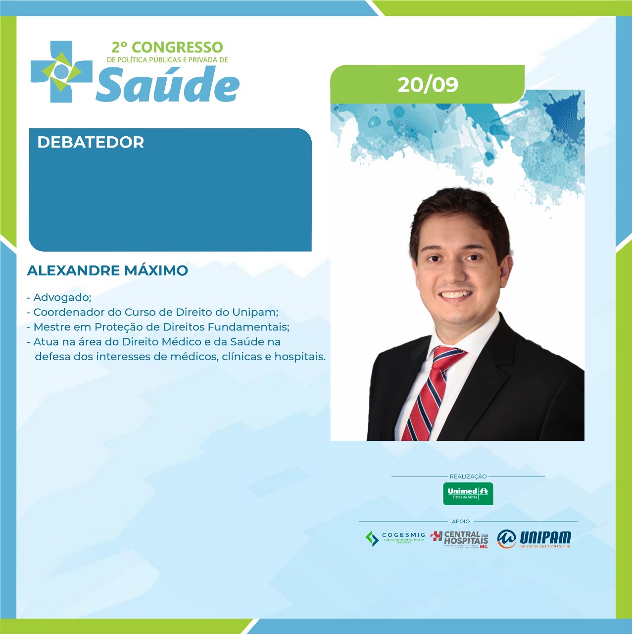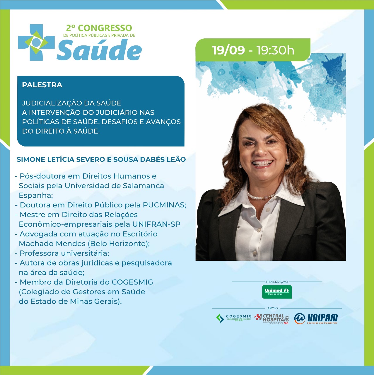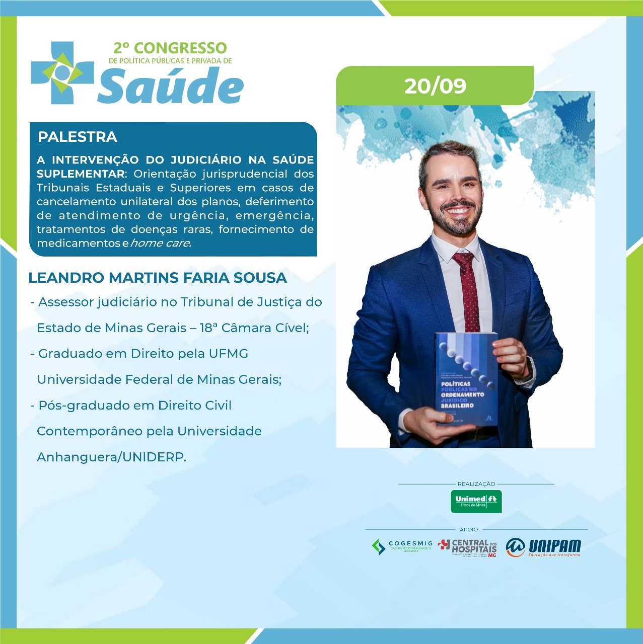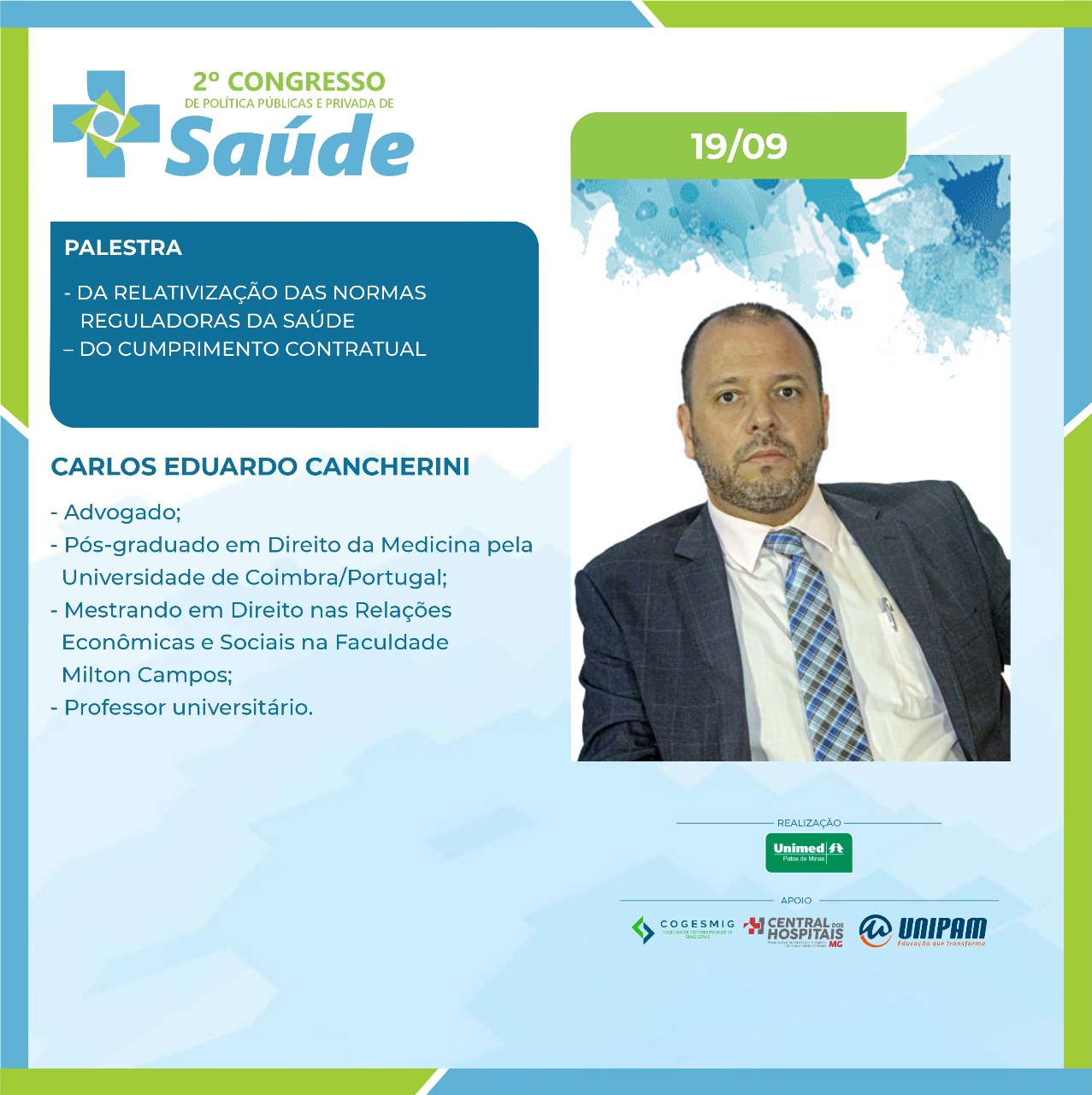 No primeiro dia, 19 de setembro (quinta-feira), serão ministradas as palestras “Judicialização da Saúde: A Intervenção do Judiciário nas Políticas de Saúde. Desafios e Avanços do Direito à Saúde”, com a Dra. Simone Letícia Severo e Sousa Dabés Leão; “Da Relativização das Normas Reguladoras da Saúde e do Cumprimento Contratual”, com o Dr. Carlos Eduardo Cancherini; e “Governança Corporativa em Saúde e o Impacto da Judicialização”, com a professora Me. Shirley Dabus Berti. Na ocasião, também estarão presentes os debatedores Dra. Daniela Câmara, Dr. Manoel Carlos, Dr. Renato Azevedo e Dr. Rodrigo Assumpção. O presidente da Unimed Patos de Minas, Dr. Anderson Afonso também participará da solenidade de abertura.