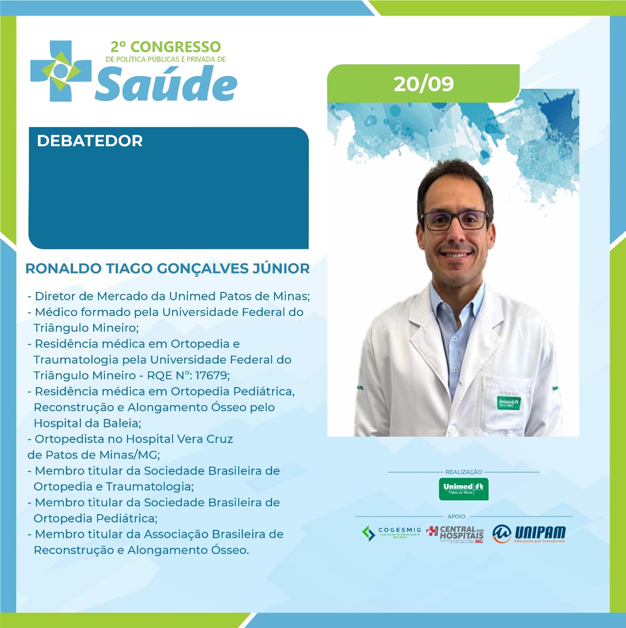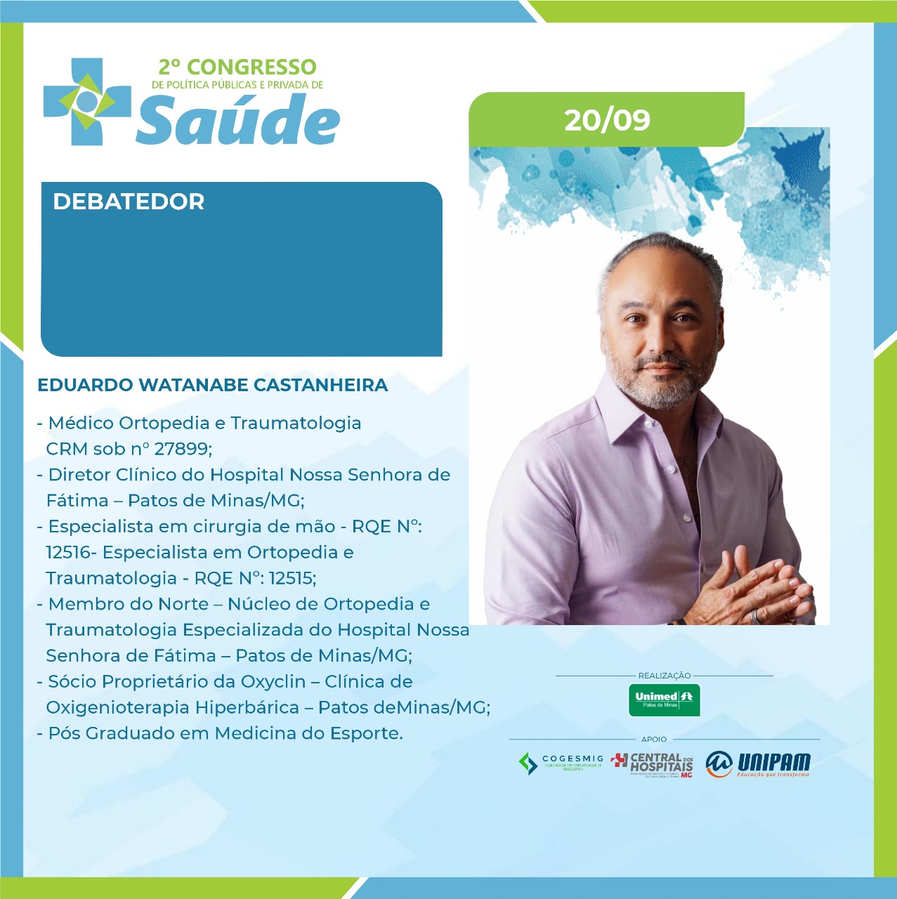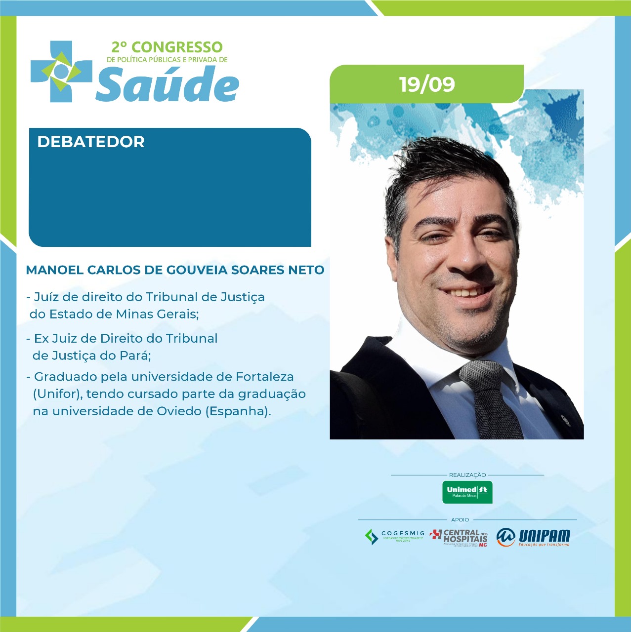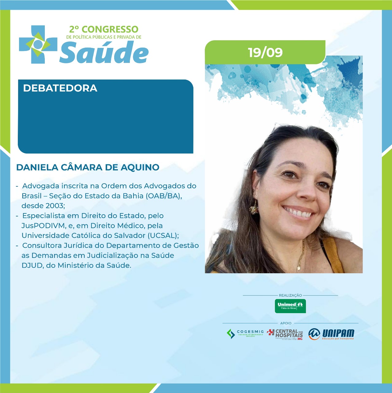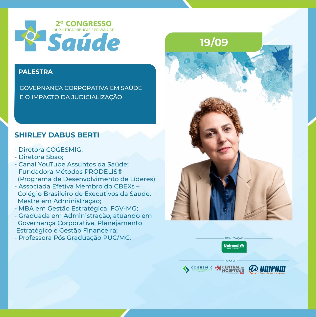 No primeiro dia, 19 de setembro (quinta-feira), serão ministradas as palestras “Judicialização da Saúde: A Intervenção do Judiciário nas Políticas de Saúde. Desafios e Avanços do Direito à Saúde”, com a Dra. Simone Letícia Severo e Sousa Dabés Leão; “Da Relativização das Normas Reguladoras da Saúde e do Cumprimento Contratual”, com o Dr. Carlos Eduardo Cancherini; e “Governança Corporativa em Saúde e o Impacto da Judicialização”, com a professora Me. Shirley Dabus Berti. Na ocasião, também estarão presentes os debatedores Dra. Daniela Câmara, Dr. Manoel Carlos, Dr. Renato Azevedo e Dr. Rodrigo Assumpção. O presidente da Unimed Patos de Minas, Dr. Anderson Afonso também participará da solenidade de abertura.