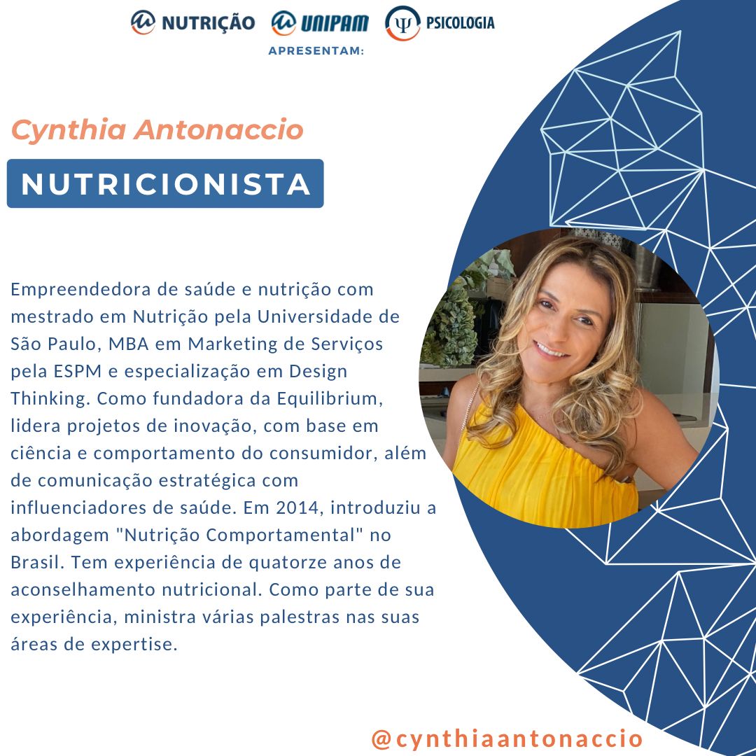 Na oportunidade, será ministrada a palestra “Nutrição Comportamental: Transformando a Relação das Pessoas com a Comida na Era Digital e seus Benefícios Psicológicos” com a nutricionista, Cynthia Antonaccio. A profissional é empreendedora em saúde e em nutrição e possui experiência, de quatorze anos, em aconselhamento nutricional.