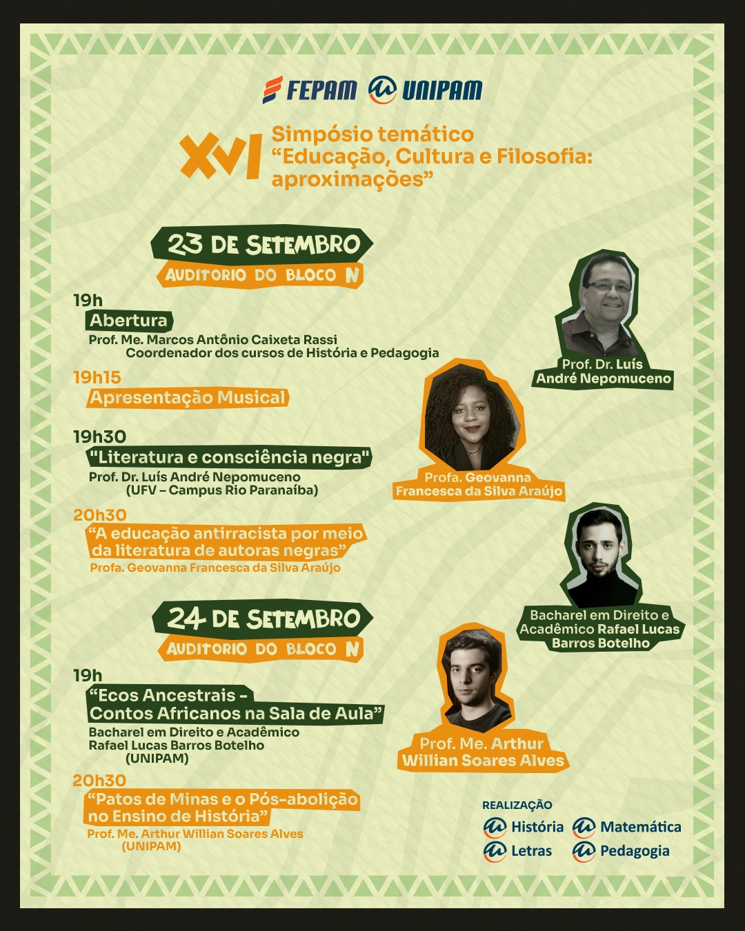 No segundo dia, 24 de setembro (terça-feira), às 19h, será realizada a palestra “Ecos Ancestrais: Contos Africanos na Sala de Aula”, com o bacharel em Direito e acadêmico, Rafael Lucas Barros Botelho. Posteriormente, às 20h30, será ministrada a palestra “Patos de Minas e o Pós-Abolição no Ensino de História”, com o professor Arthur Willian Soares Alves.