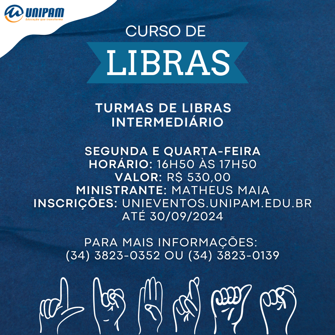O Centro Universitário de Patos de Minas (UNIPAM) promoverá, às segundas e às quartas-feiras, das 16h50 às 17h50, o curso Língua Brasileira de Sinais (Libras). Esse será ofertado no nível intermediário.