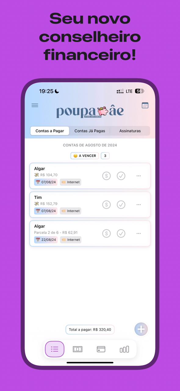 O primeiro aplicativo intitulado “Poupa-âe!” é um gerenciador de finanças pessoais com funções avançadas. Com ele, o usuário pode cadastrar despesas e configurar lembretes de pagamento, tais como: aluguel, conta de água, conta de energia, entre outros. Um dos grandes diferenciais é a possibilidade de registrar pagamentos parciais, adiar vencimentos e até dividir contas. Além disso, o “Poupa-âe!” oferece uma funcionalidade única: a definição de metas financeiras. Por exemplo, se o usuário deseja economizar R$50 mil para comprar um carro, o aplicativo utiliza a inteligência artificial para sugerir planos personalizados de economia. Ele ainda gera relatórios detalhados, oferece uma interface intuitiva para personalização e inclui uma prática lista de compras, tornando-se uma ferramenta completa para a gestão financeira.
