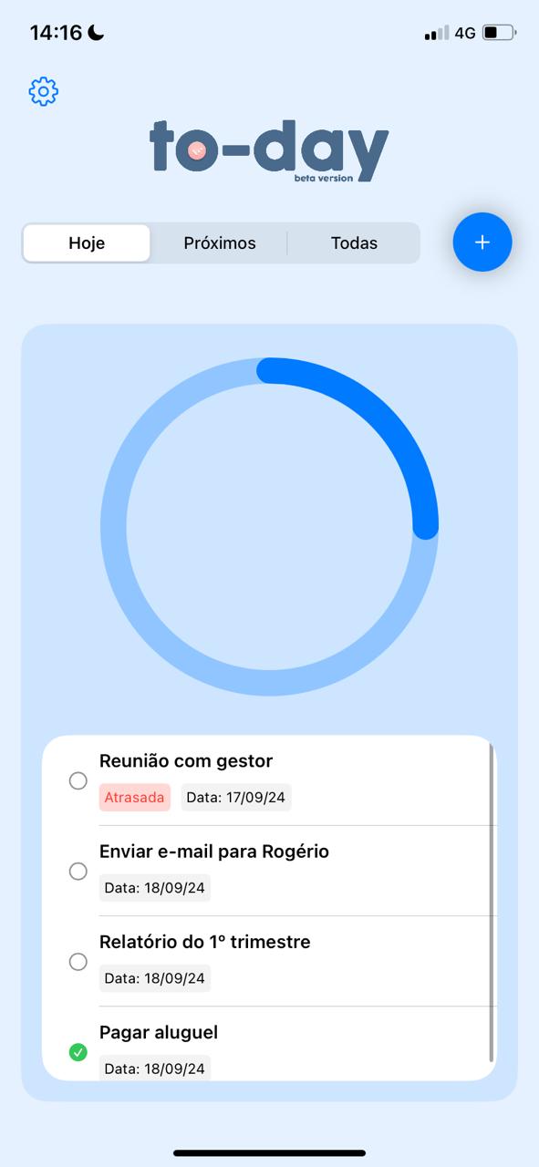 O segundo aplicativo desenvolvido é o “To-day”, um gerenciador de tarefas focado na organização pessoal. Ele permite ao usuário criar lembretes, acompanhar o progresso e ainda oferece incentivo para que as atividades diárias sejam concluídas.