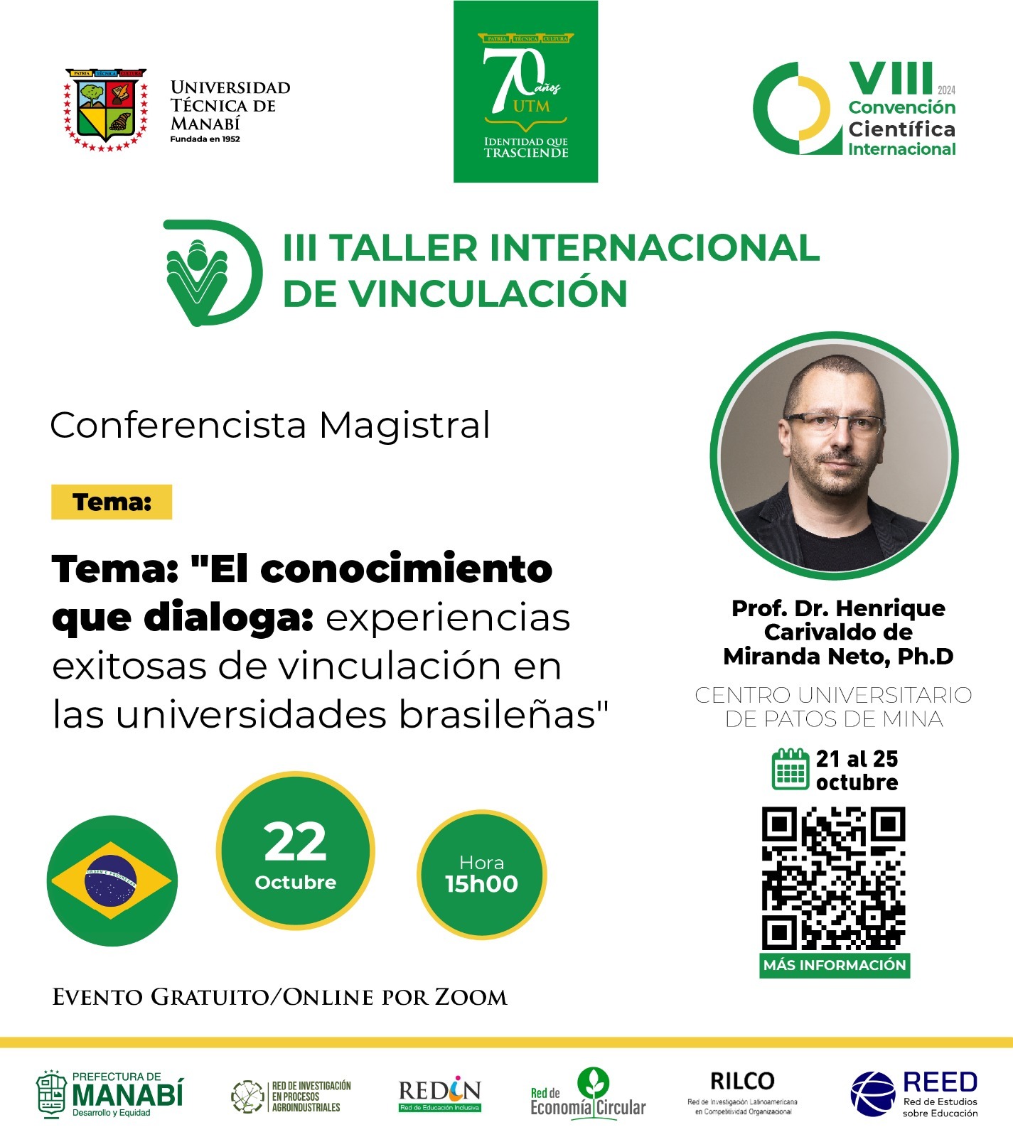 Em outubro, o professor Henrique ministrou a palestra “El conocimiento que dialoga: experiencias de vinculación en las universidades brasileñas”, no III Taller Internacional de Vinculación, na VIII Convención Científica Internacional, promovida pela Universidad Técnica de Manabí (UTM), no Equador.