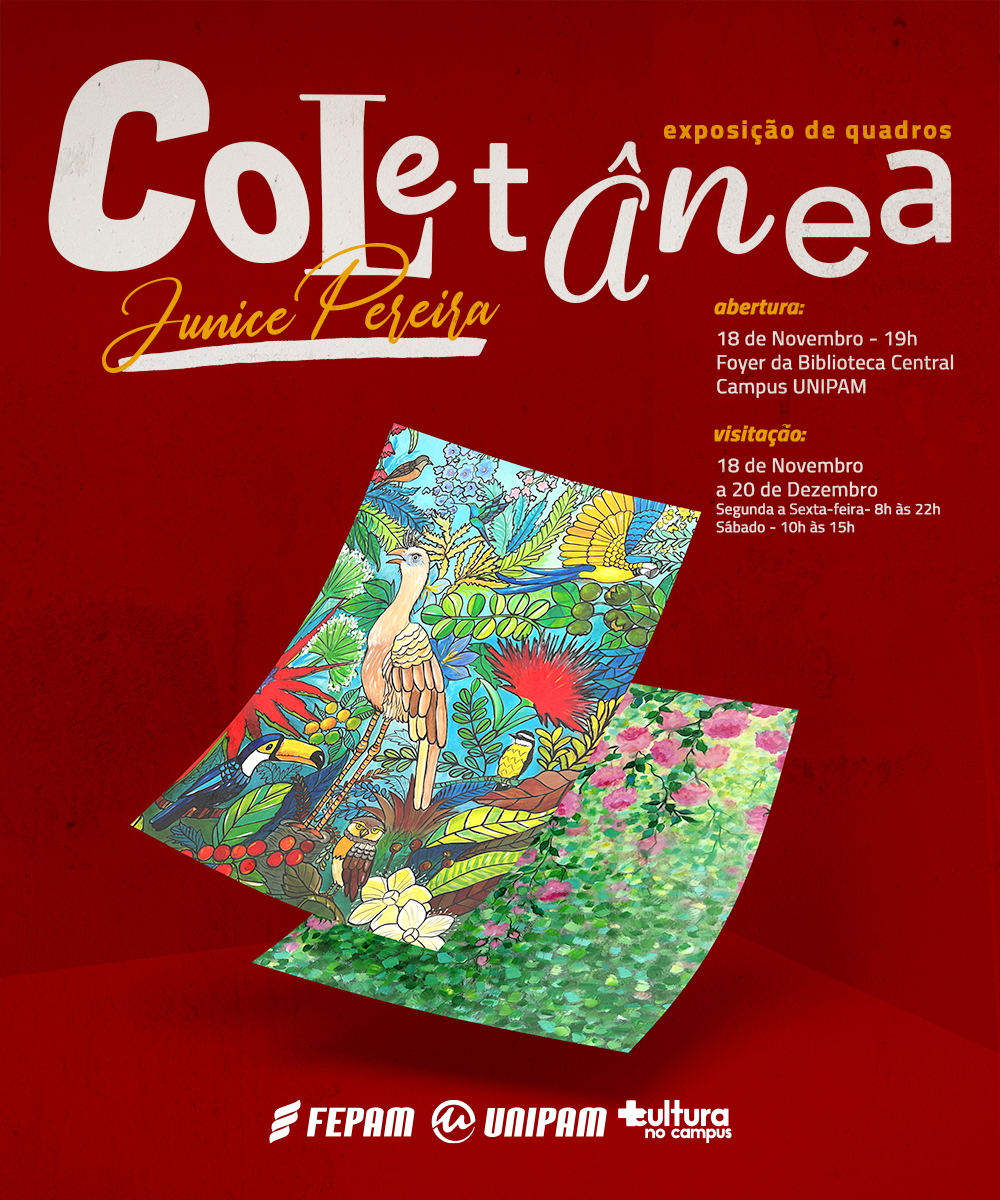A artista plástica Junice Pereira irá expor, de 18 de novembro a 20 de dezembro, seus trabalhos no foyer da Biblioteca do Centro Universitário de Patos de Minas (UNIPAM). A exposição “Coletânea” contará com 16 obras e retrata a vida artística de Junice em diferentes fases. A solenidade de abertura ocorrerá, às 19h, no dia 18 de novembro (segunda-feira).