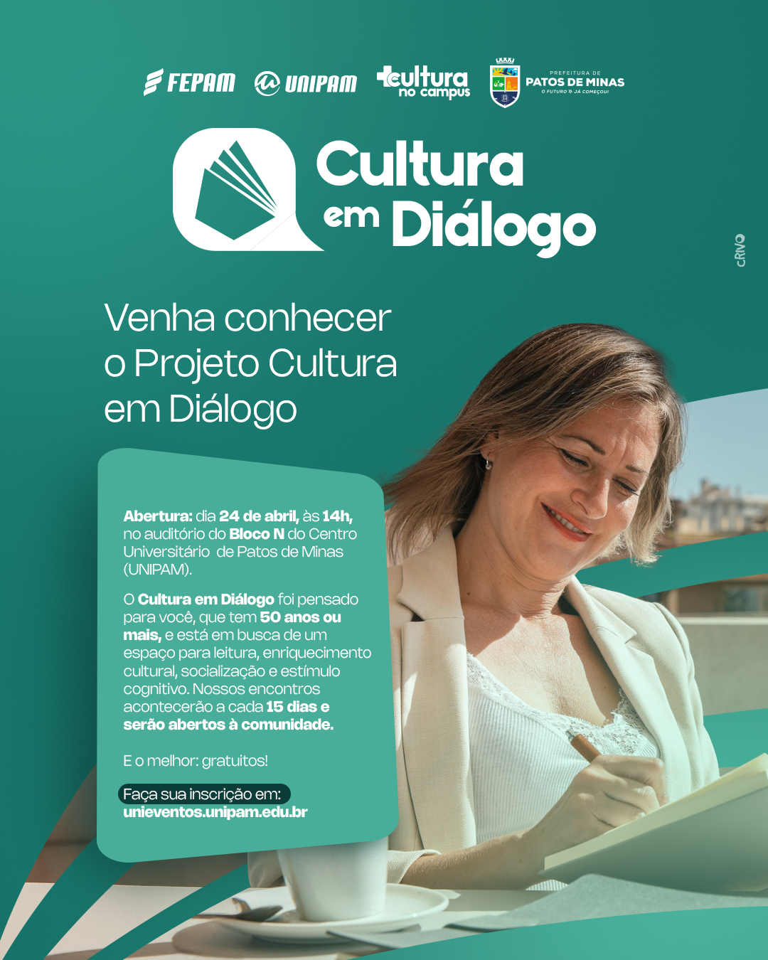 O “Cultura em Diálogo” tem o apoio da Fundação Educacional de Patos de Minas (FEPAM), do UNIPAM e da Prefeitura de Patos de Minas, por meio da Secretaria Municipal de Cultura, Turismo, Esporte e Lazer.