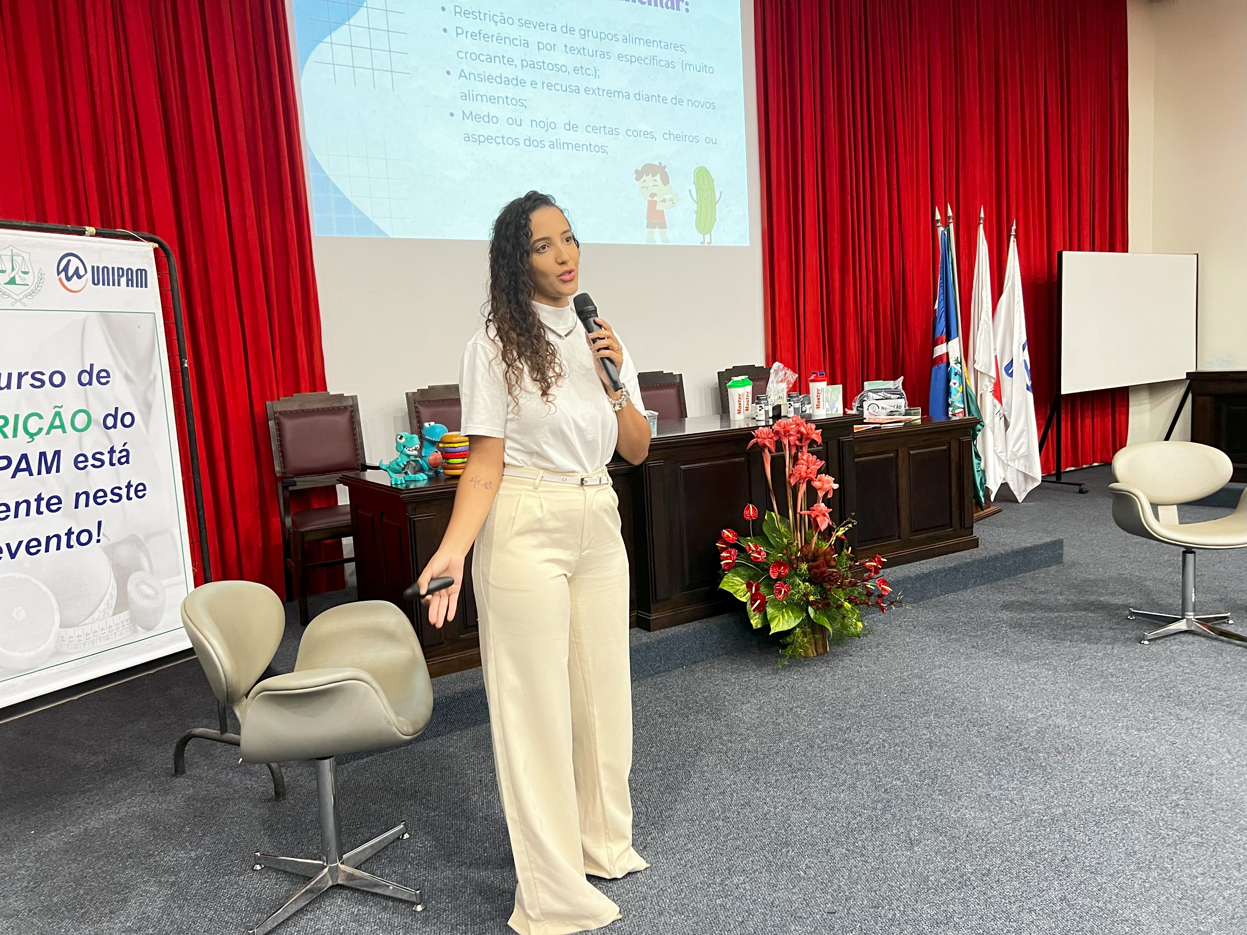 Inicialmente, a nutricionista e egressa do curso, Bruna Elen Santos de Brito, fez abertura da noite abordando os desafios e as estratégias nutricionais no cuidado infantil, com foco especial em casos de seletividade alimentar e de autismo. Durante a palestra, ela explicou aos alunos como é, na prática, conduzir um atendimento nutricional para crianças. Bruna Elen também falou sobre a obesidade infantil e promoveu uma dinâmica interativa sobre a percepção de gostos individuais, reforçando a importância da empatia e da personalização no atendimento.