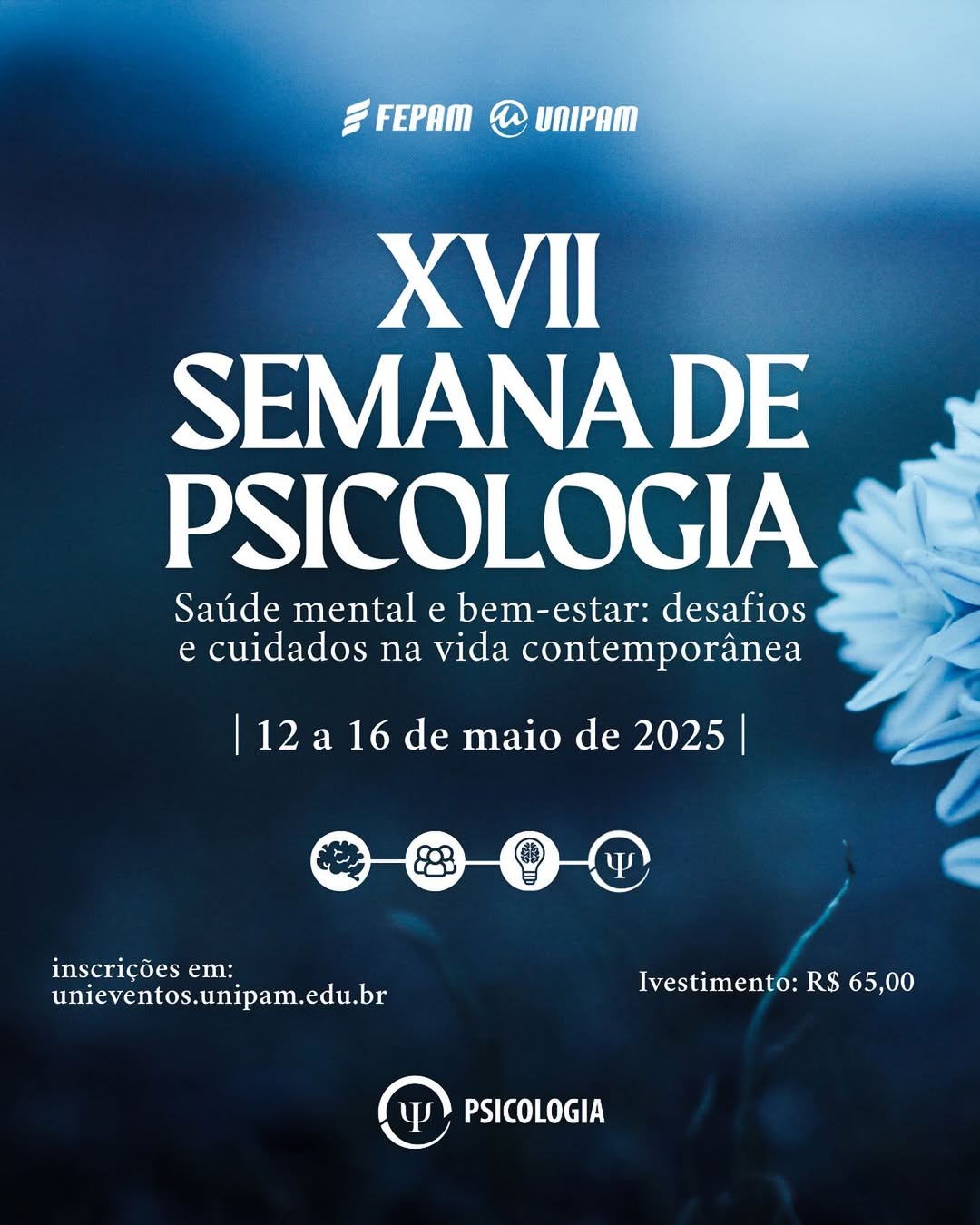 O Centro Universitário de Patos de Minas (UNIPAM), promoverá, de 12 a 16 de maio, no Centro de Convenções e Eventos (CCE) e no Bloco F, a “XVII Semana de Psicologia”. O evento, este ano, tem como tema “Saúde Mental e Bem-Estar: Desafios e Cuidados na Vida Contemporânea”.