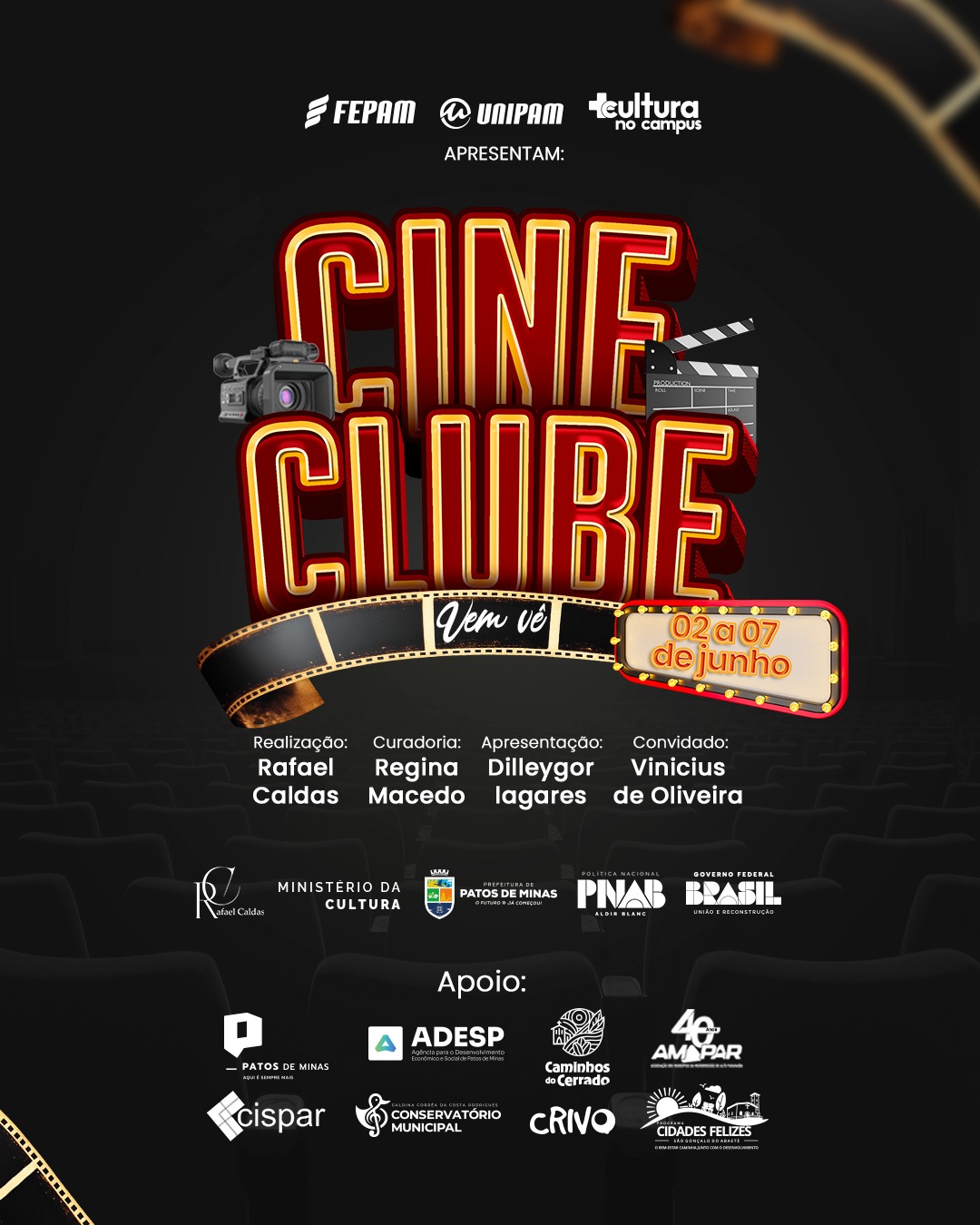 Será promovido de 02 a 07 de junho, no auditório do bloco N e no Salão do Júri, do Centro Universitário de Patos de Minas (UNIPAM), o Cine Clube Vemvê. Realizado pelo produtor Rafael Caldas, o evento conta com o patrocínio da Prefeitura de Patos de Minas, por meio do edital da Política Nacional Aldir Blanc de Fomento à Cultura (PNAB), do Ministério da Cultura. O UNIPAM é parceiro do evento, por meio do programa “Mais Cultura no Campus”.