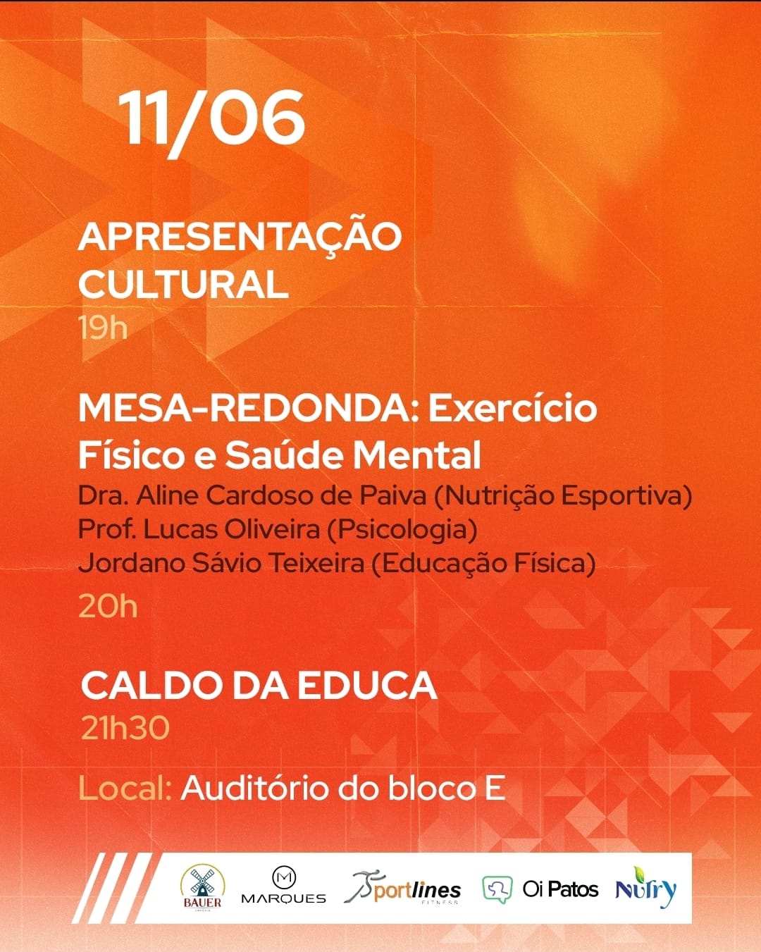 No terceiro dia, 11 de junho (quarta-feira), às 19h, no auditório do bloco E, ocorrerá uma apresentação cultural. Posteriormente, às 20h, será realizada a mesa-redonda “Exercício Físico e Saúde Mental” com a Dra. Aline Cardoso de Paiva, com o professor Lucas Oliveira e com Jordano Sávio Teixeira.