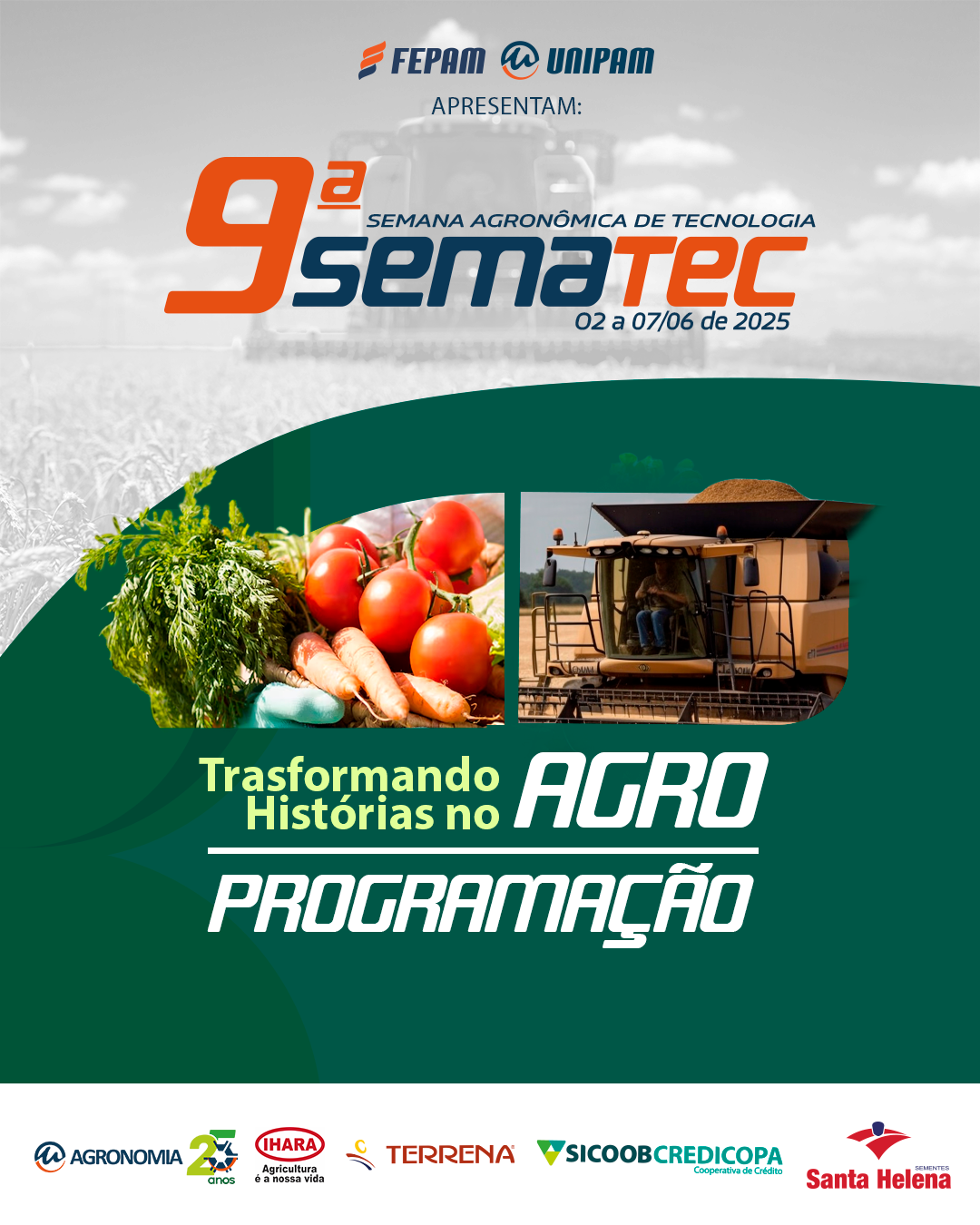 O curso de Agronomia do Centro Universitário de Patos de Minas (UNIPAM), promoverá, de 02 a 07 de junho, a 9ª Semana Agronômica de Tecnologia (SEMATEC). O evento, este ano, tem como tema “Transformando Histórias no Agro”.