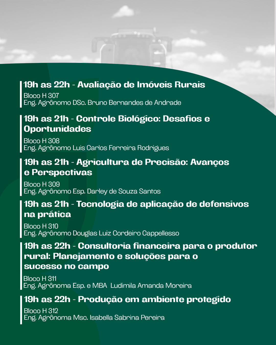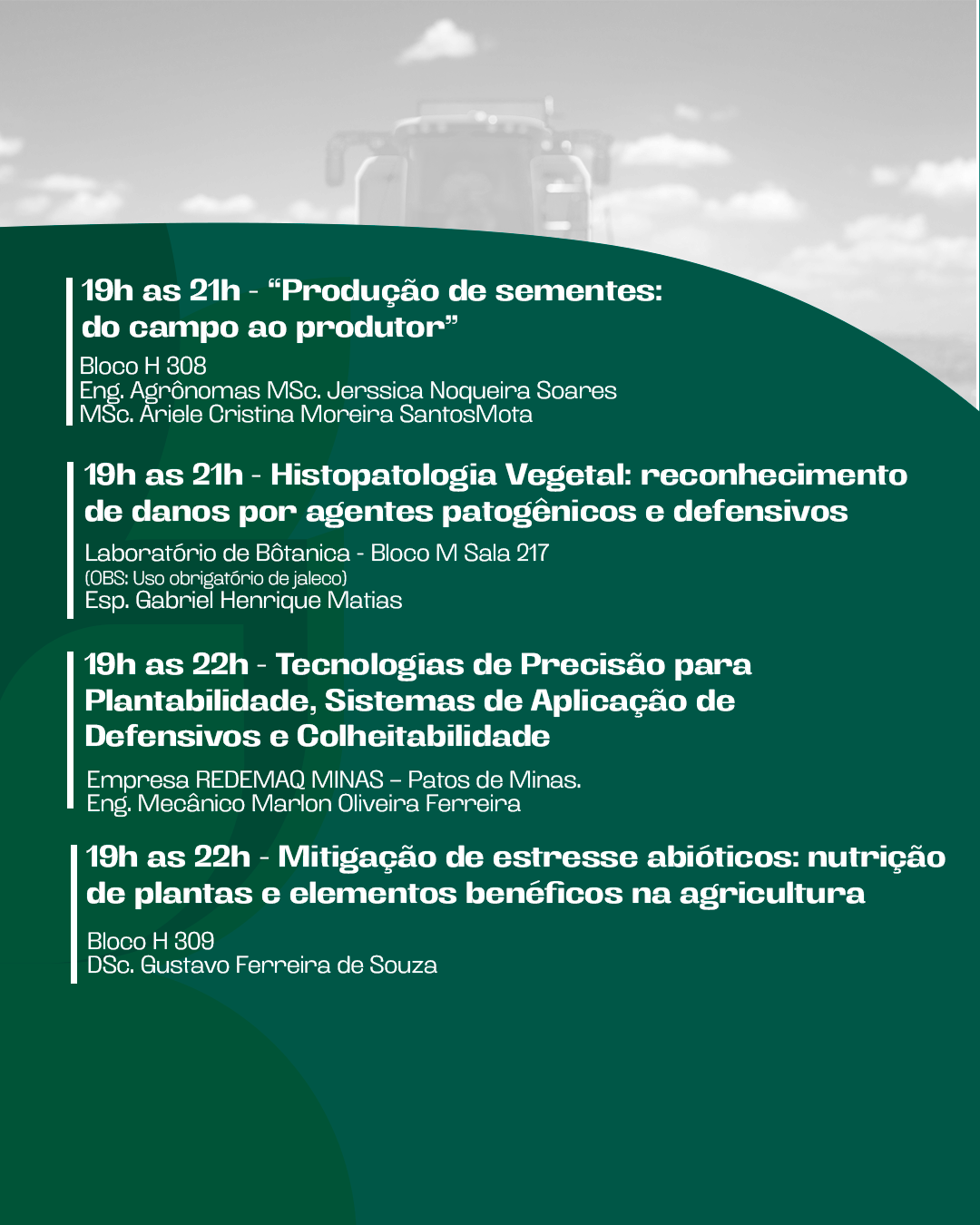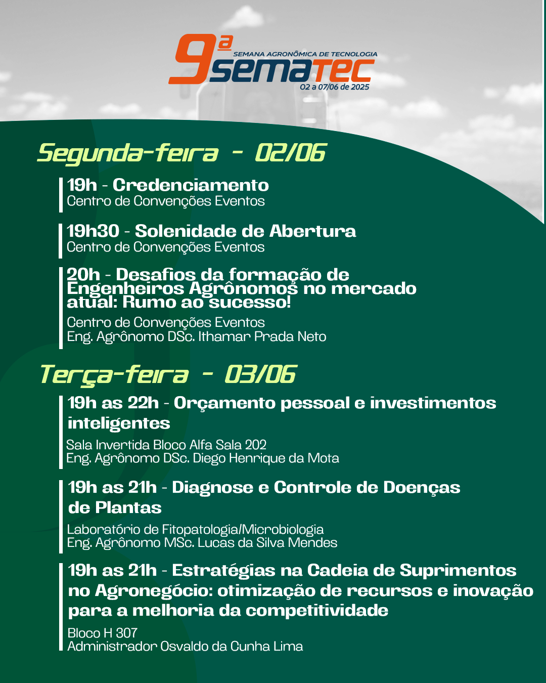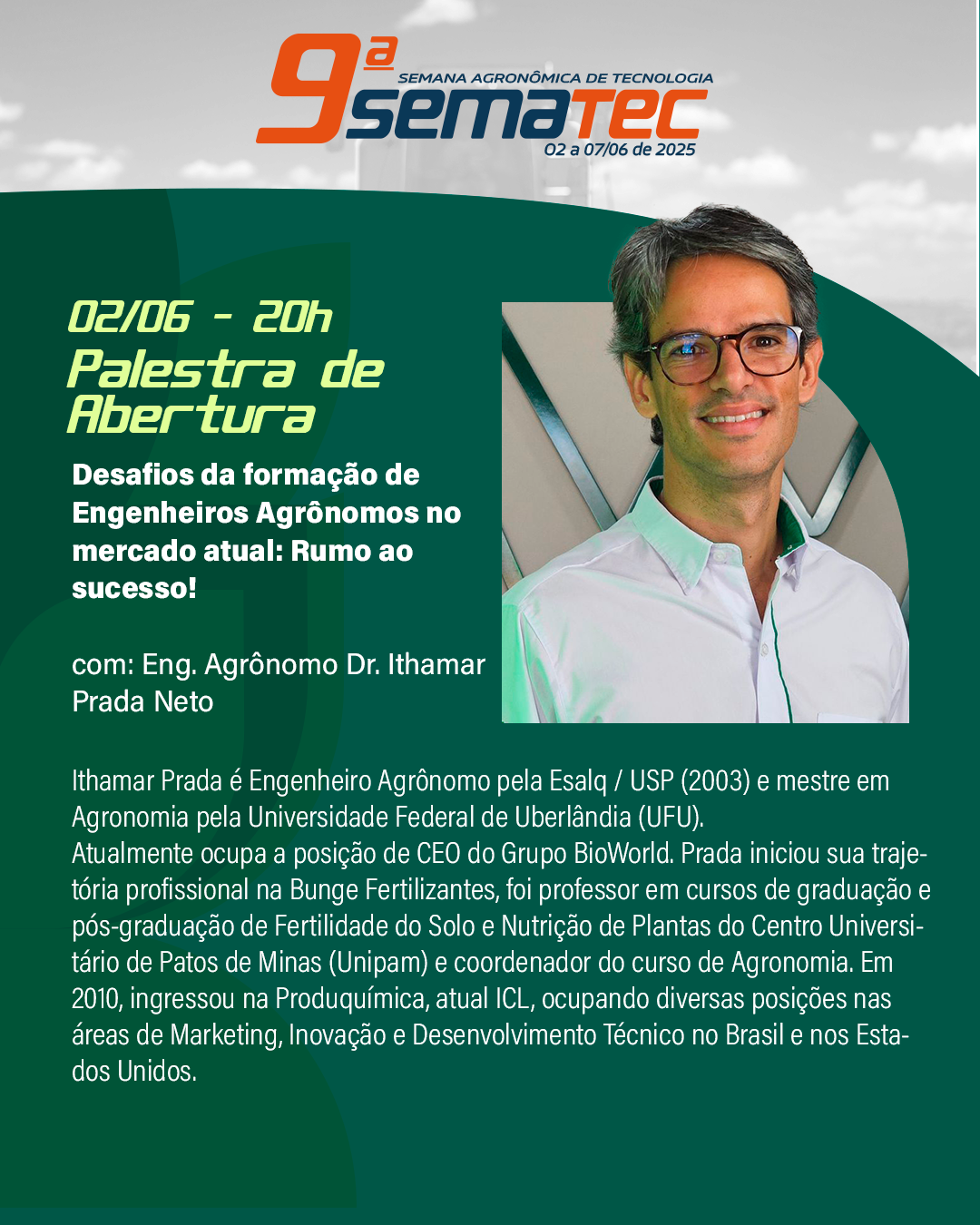 No dia 02 de junho (segunda-feira), às 19h30, no Centro de Convenções e Eventos (CCE), será realizada a solenidade de abertura. Posteriormente, às 20h, ocorrerá a palestra “Desafios da Formação de Engenheiros Agrônomos no Mercado Atual: Rumo ao Sucesso” com o engenheiro agrônomo, Dr. Ithamar Prada Neto.