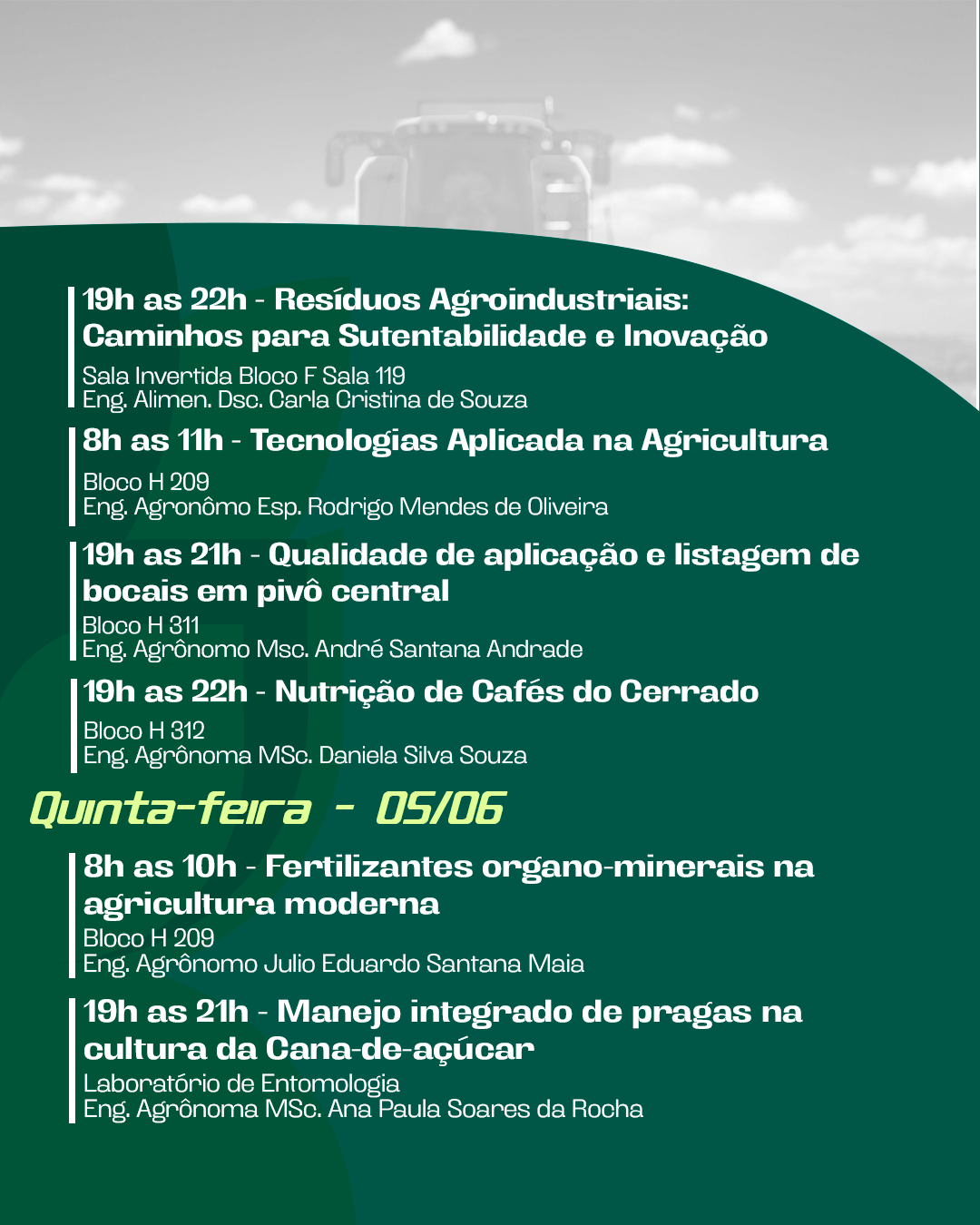 Para encerrar, no dia 07 de junho (sábado), às 8h, na Escola Agrícola, será promovido o “Dia de Campo”.
