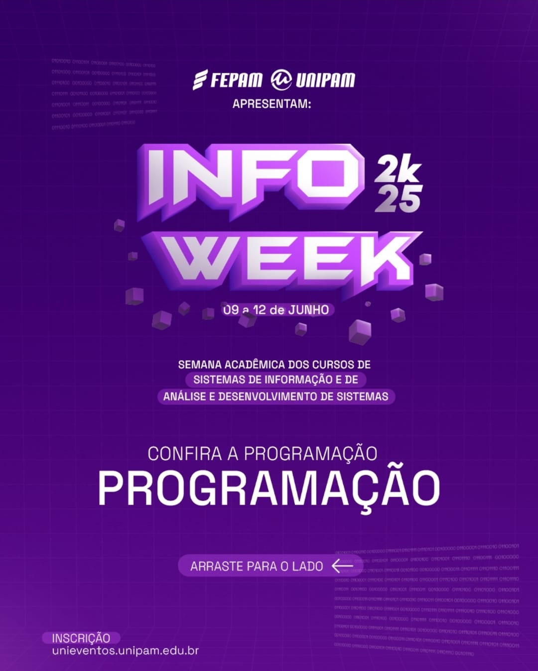 Os cursos Análise e Desenvolvimento de Sistemas e Sistemas de Informação do Centro Universitário de Patos de Minas (UNIPAM), promoverão, de 09 a 12 de junho, no auditório do bloco N, a Info Week. O evento contará com palestras e com minicursos.