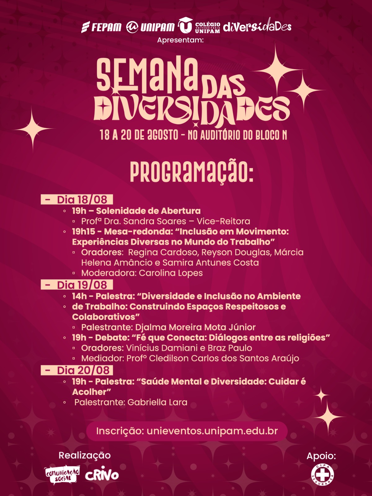 20 de agosto (quarta-feira) - Palestra “Saúde Mental e Diversidade: Cuidar é Acolher”, com foco nos impactos emocionais das violências sofridas por minorias e a importância de políticas públicas de acolhimento.