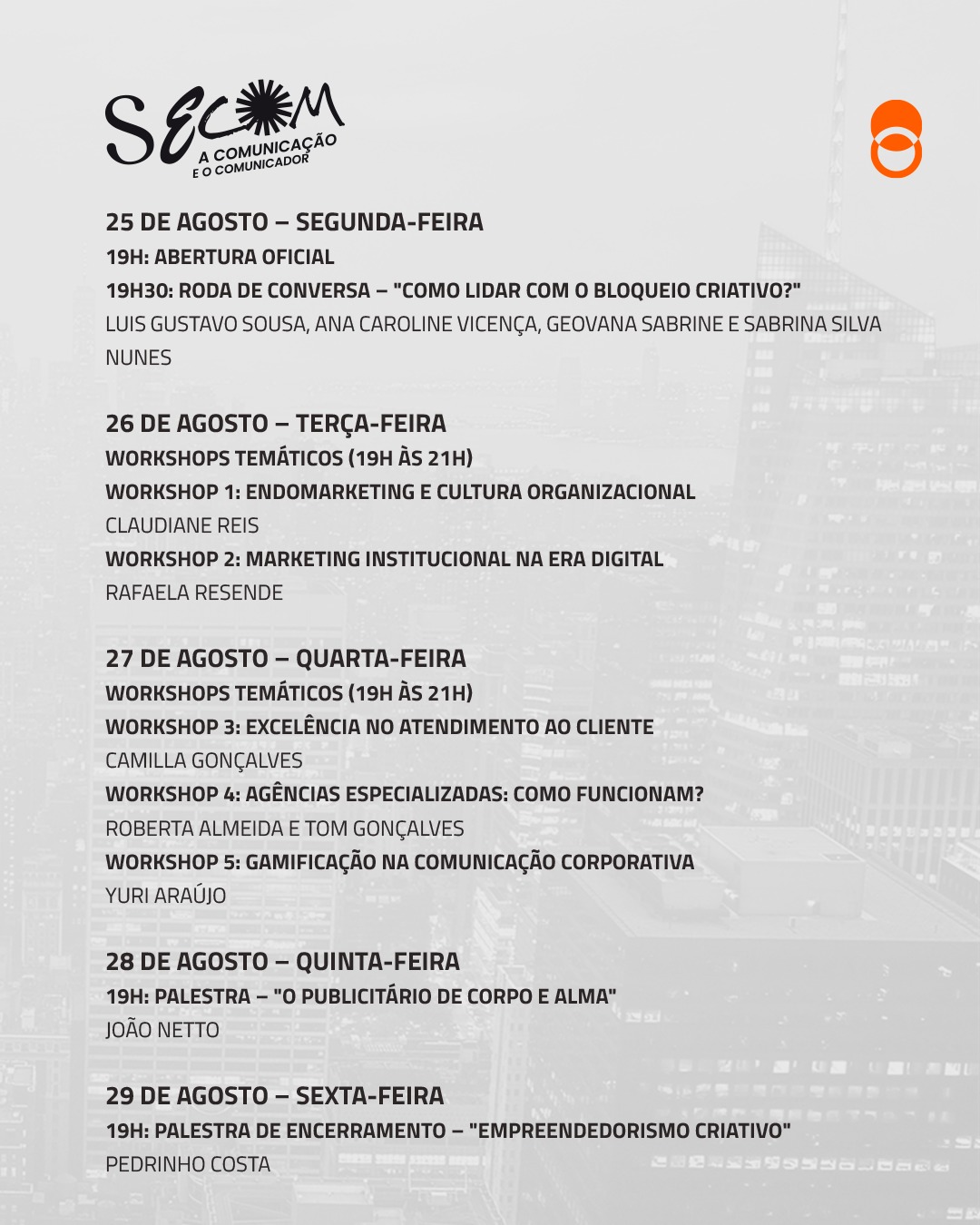 Os encontros abordarão desde bloqueio criativo, marketing institucional, endomarketing e cultura organizacional até gamificação, excelência no atendimento e empreendedorismo criativo.