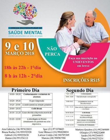 Alunos dos cursos de Medicina e Psicologia do Centro Universitário de Patos de Minas (UNIPAM) realizarão nos dias 9 e 10 de março, no auditório do Bloco E, a I Jornada Multidisciplinar em Saúde Mental. No primeiro dia, o evento acontecerá das 18h às 22h e no segundo dia, das 8h às 12h.