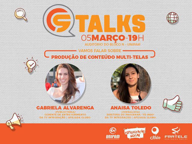 A coordenação dos cursos de Comunicação Social - Jornalismo e Publicidade e Propaganda do Centro Universitário de Patos de Minas (UNIPAM) realizará no dia 5 de março, às 19h, no auditório do Bloco N, a terceira edição do CS TALKS.